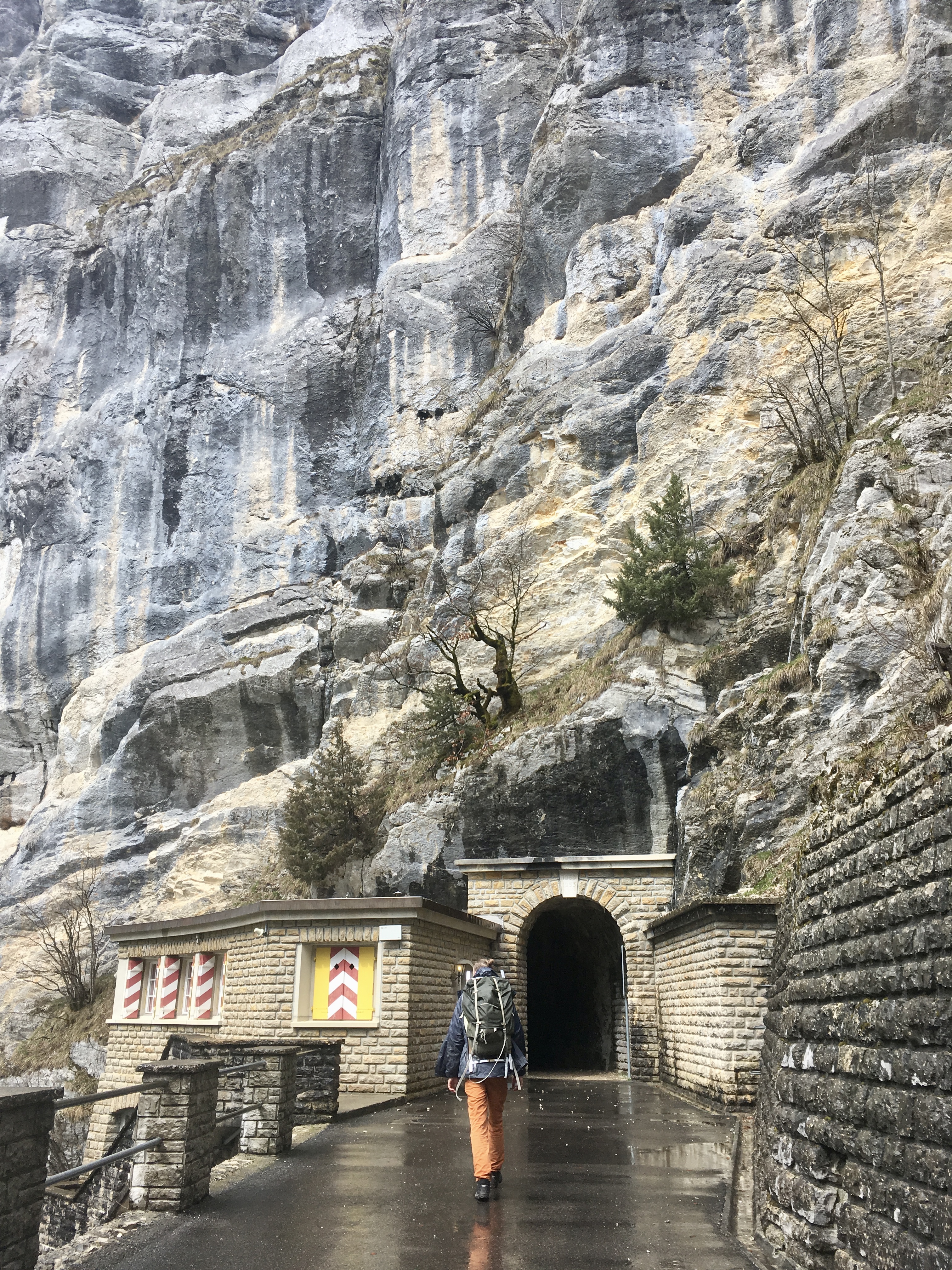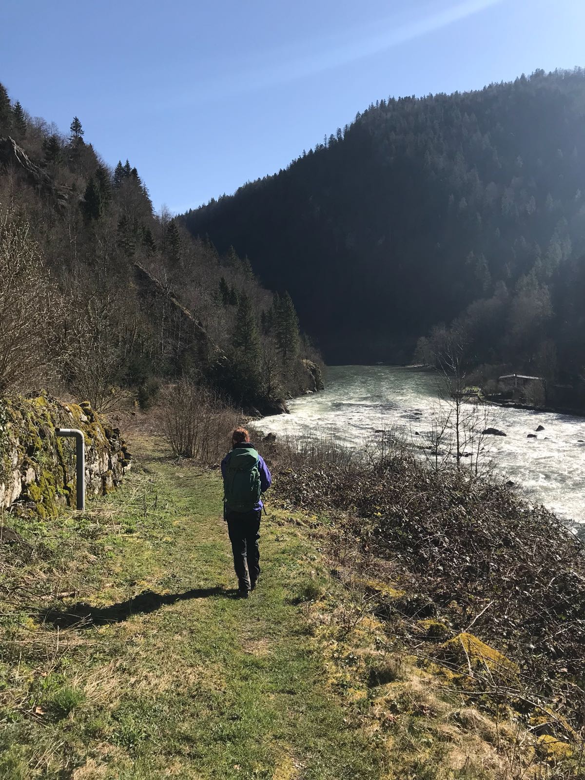 We took the train and bus to Les Brenets on a grey rainy April day, with a few patches of blue sky, which implied that it might open up a bit more during the day. I was exited to explore the route from Les Brenets to Maison Monsieur that I have heard being compared to the Norwegian Fjords. Once again the lack of sun didn’t bother me but rather seemed fitting to the magical surroundings that we would find ourselves in, after passing through the village of Les Brenets down to the river. Walking through those wild nature-built canyons, we reached “Saut du Doubs” after about 50 minutes. You could hear the 27 meter high waterfall roaring, before you would see it, while the Doubs would turn into a wild river, the closer we got to the waterfall. We took a moment to observe the water flowing down over the rocks, splashing uncontrolled and playfully.