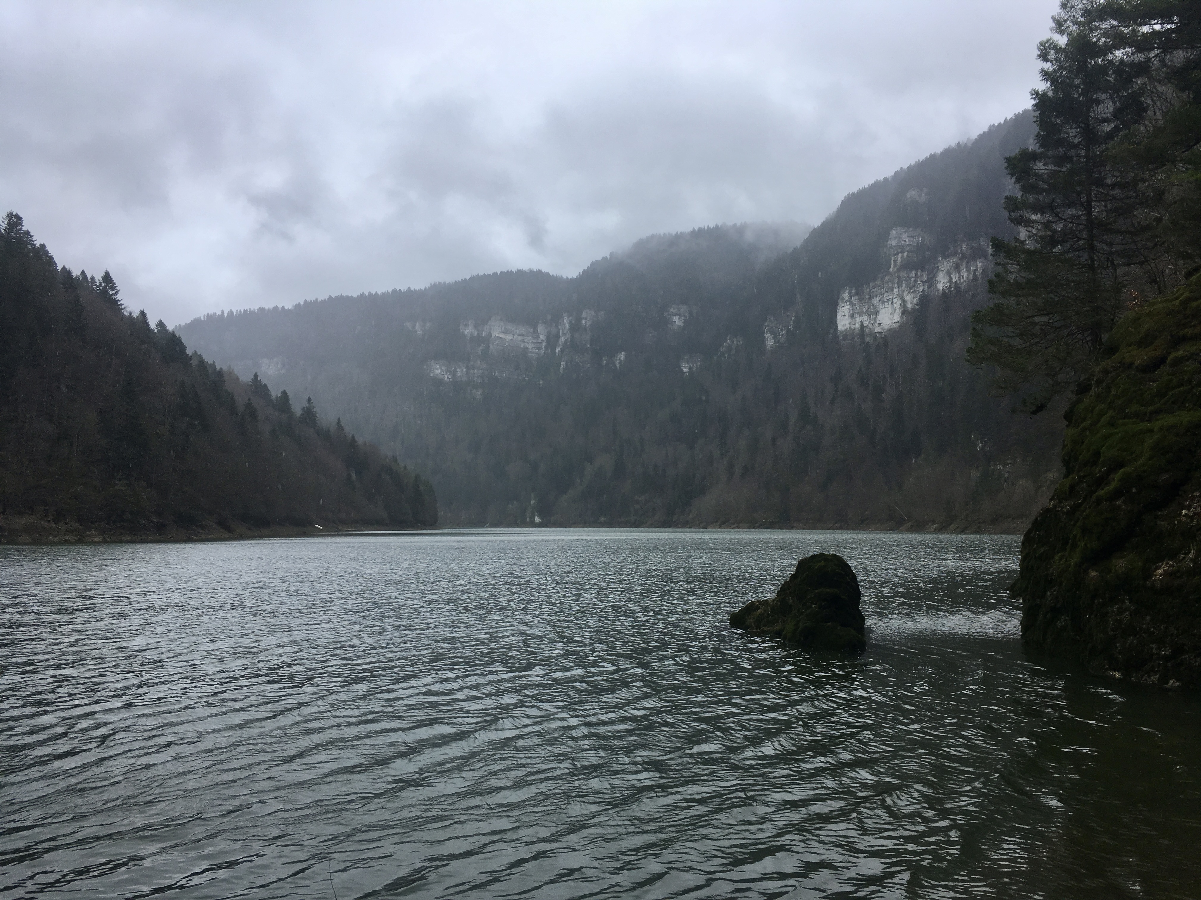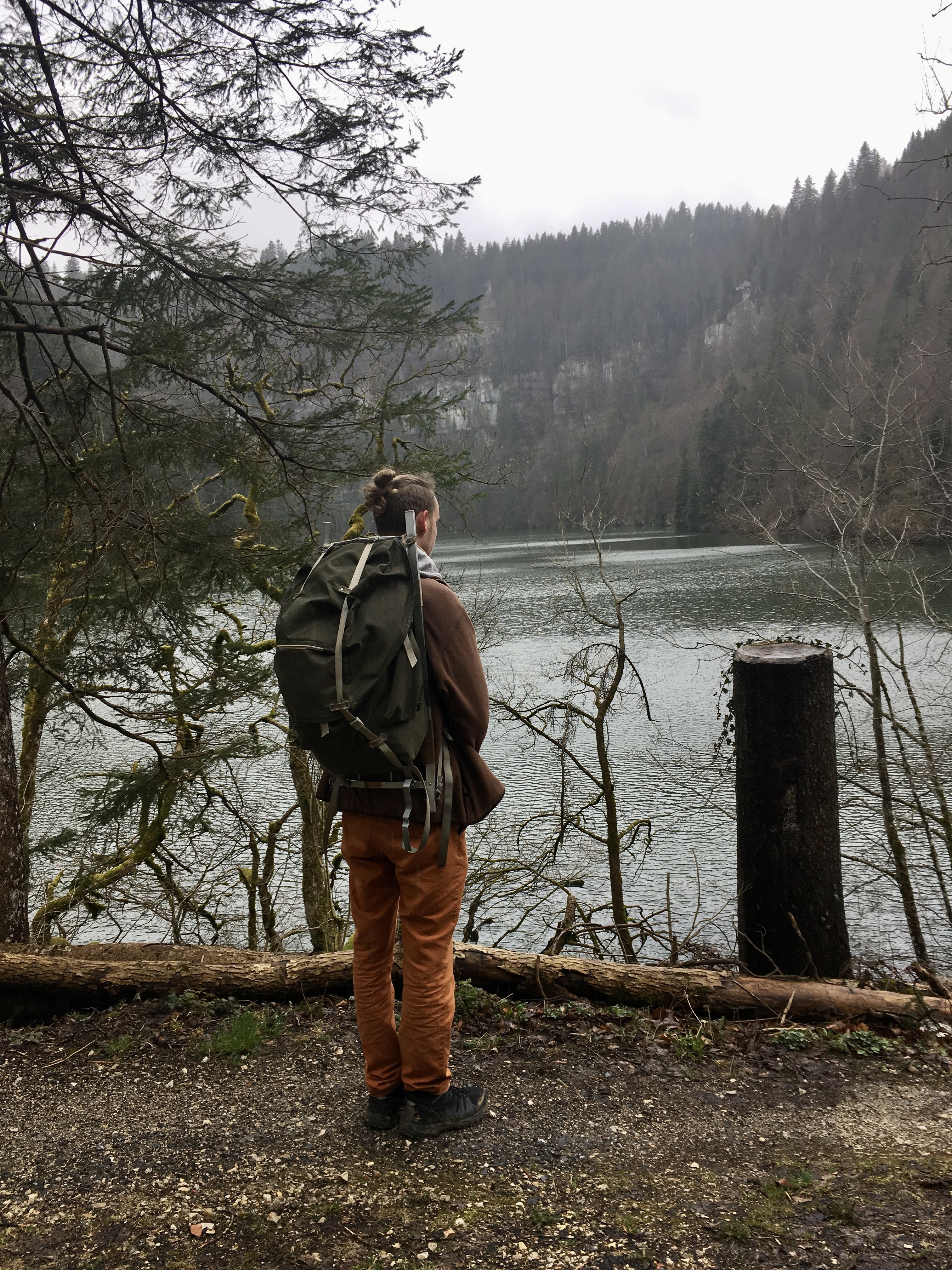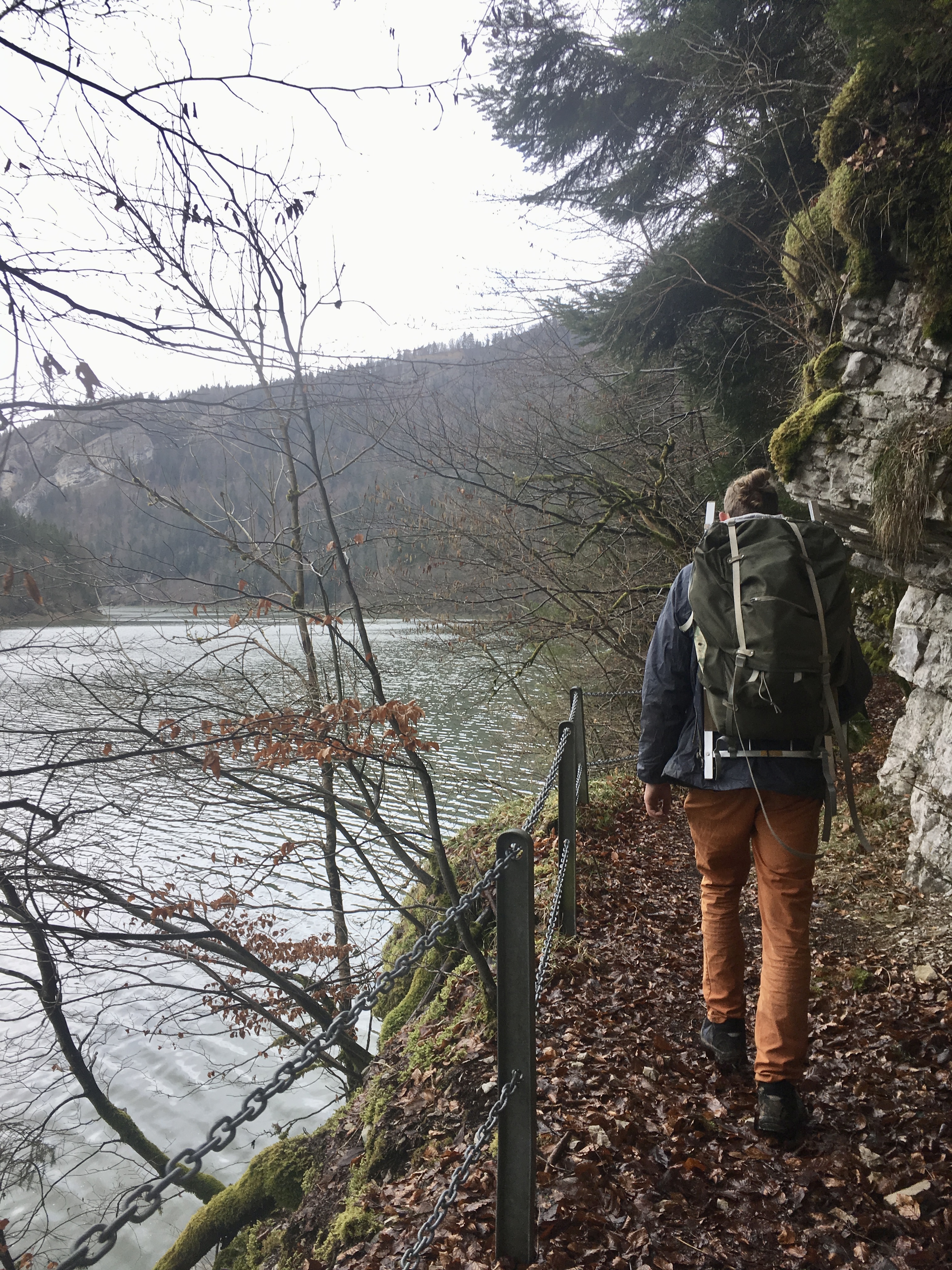 After leaving the Saut du Doubs, we eventually reached the Lac de Moron, a lake damming the Doubs; it was fascinating to see the different “temperaments” of the water – going from that untamed and splashing river to this still and peaceful lake. On a narrow path we walked right next to the lakeside; there was no sound except the occasional birdsong and the rustling of the fallen leaves beneath our feet. Once again I got the feeling of being one of the two only humans on earth, exploring a new world on this chilly morning. The effortless bends of the river reminded me of how artistic nature can be, when left untouched (at least for the most part). Like a brushstroke the water lead through the canyon, the forest to it’s left and right laying calmly, partially covered in slow wandering wafts of mist.
