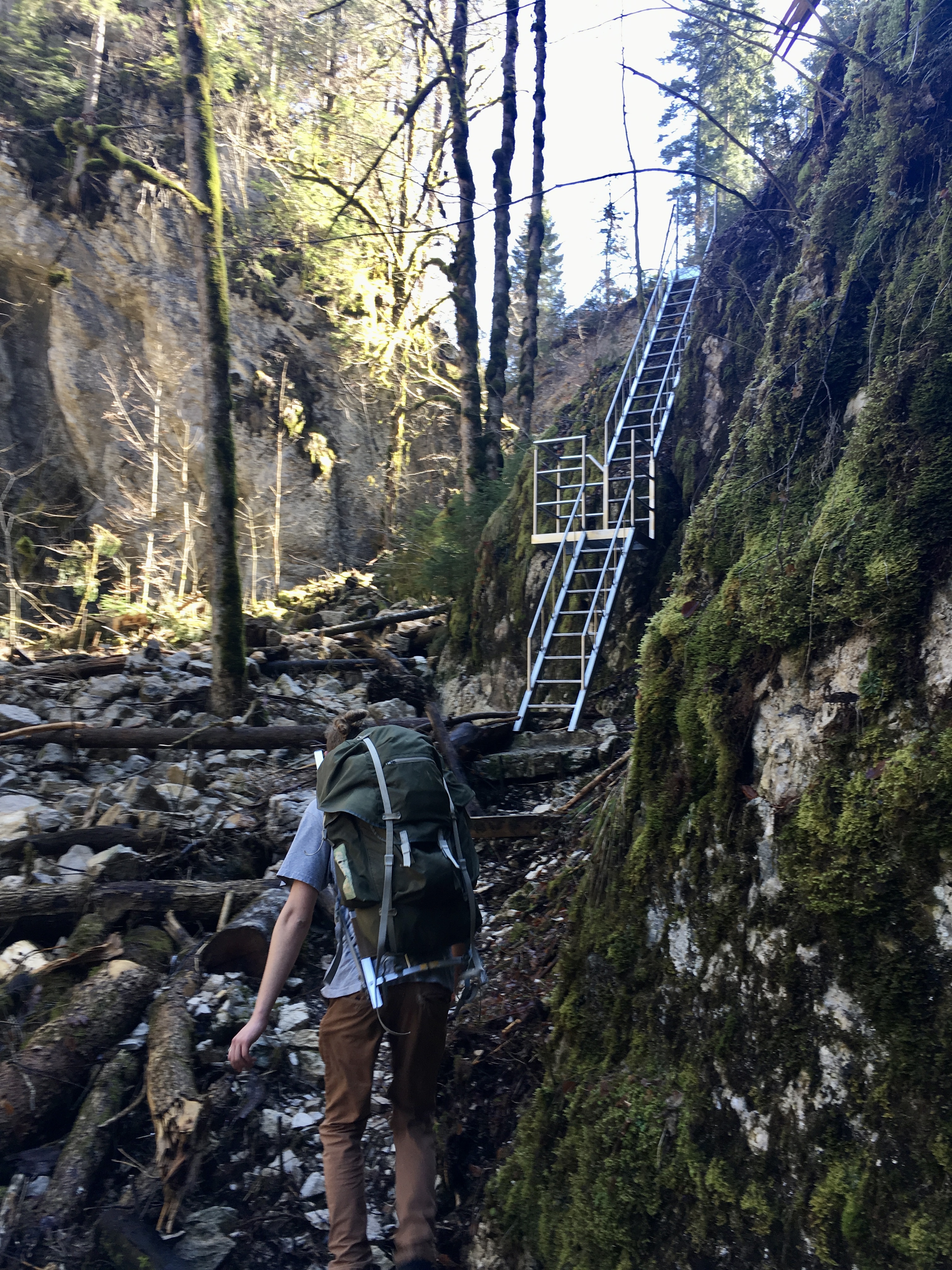 We followed the hiking path direction “La Ferrière”, which led us first through a fairytale-like forest in the “Combe de Biaufond”, partially over little bridges and stairs, before we reached the part that gave the hike it’s T2 label: Several ladders climbing up steep rocks out of the valley. The ladders were in general well fixed, clearly well maintained and had a railing that you can hold onto as well as several “pedestals” to catch your breath if necessary. I followed through with my plan to just not look back down while climbing and focus only on the next step. I was very happy with myself, to reach the top with barely any difficulties and I am grateful, when even comparably short sections like this are being labeled as T2, so one can prepare for the challenge (or choose a different route).