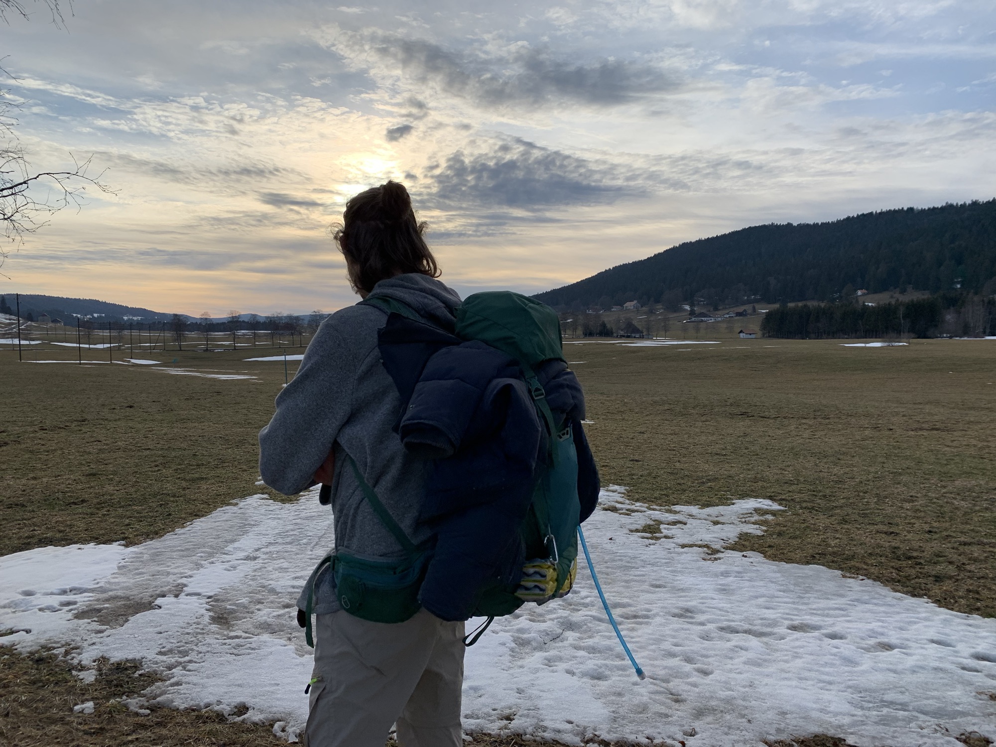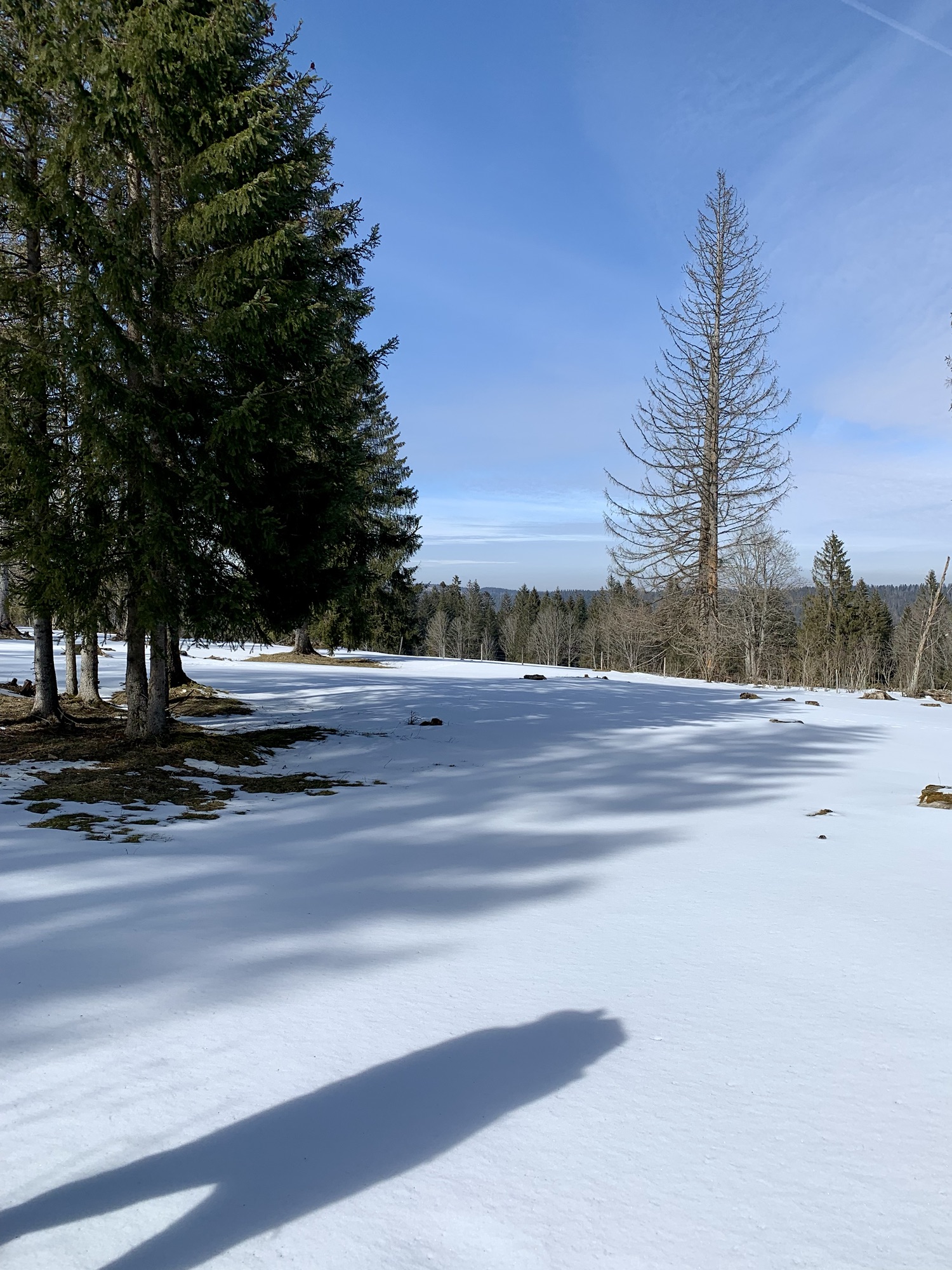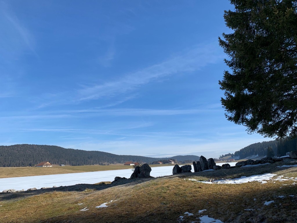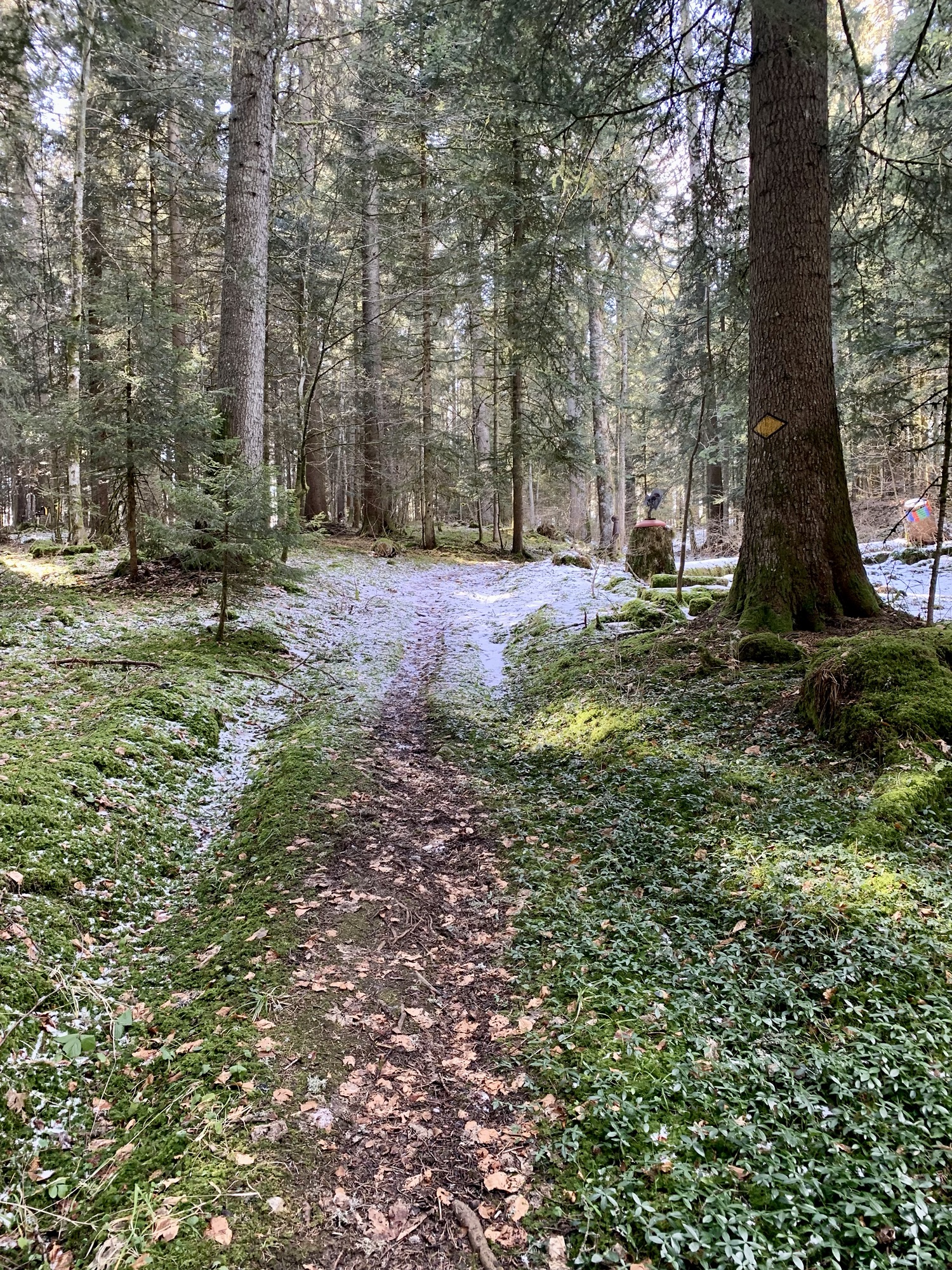 I started on a relatively sunny but cold early March day in the little village of La Sagne. The trail started by crossing the Vallée des Ponts, an enclosed high valley around 18 km long and heading to the forest across. It was here, that I sent a grateful message to Sam, who urged me to still take my snow hiking shoes in case the path was still snowy or icy. Being in the little valley Combe des Quignets with very little sun exposure, there was still quite a bit of it.
