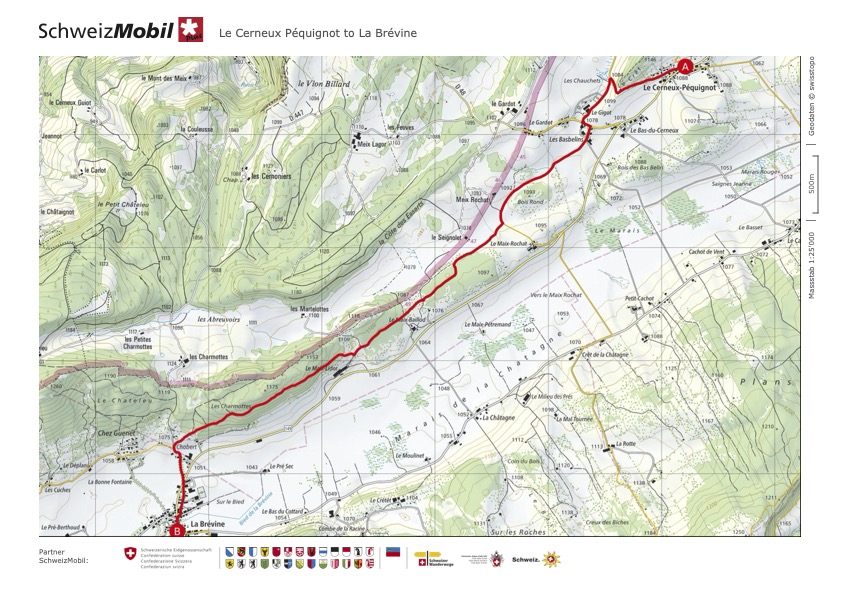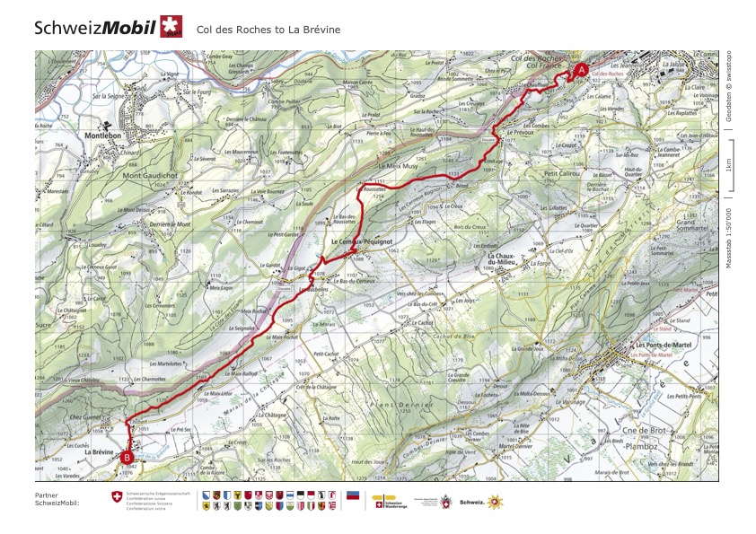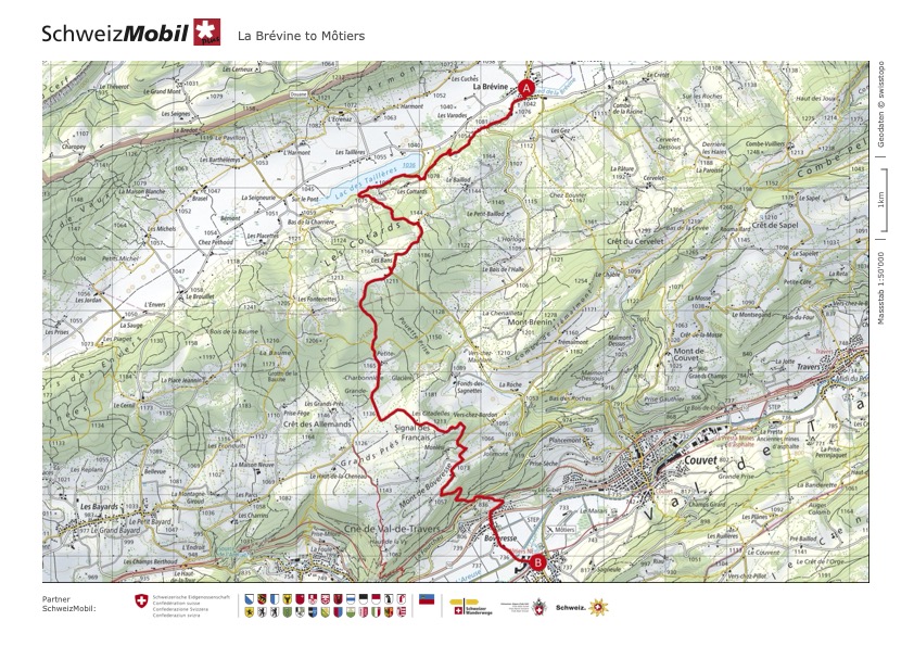 | Day 2: La Brévine to Môtiers | Difficulty: T1 (Hiking Trail) Length: 15.41 km Duration: 4:09 h Ascent/Descent: 391m/699m |
