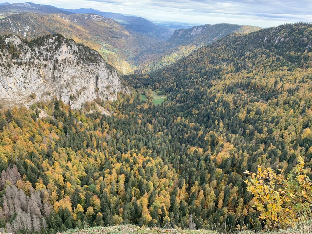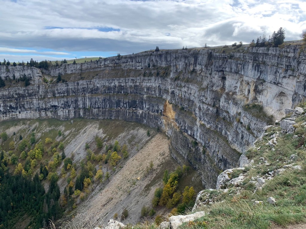 Despite having been to the Creux du Van many times before, it was again a breathtaking experience to arrive at the edge of the rocky cirque. The sunlight illuminated parts of the forest below in the valley, the firs and colorful beeches building a stark contrast to the grey of the rocks and the Moraine and landslide material at the bottom of the canyon.