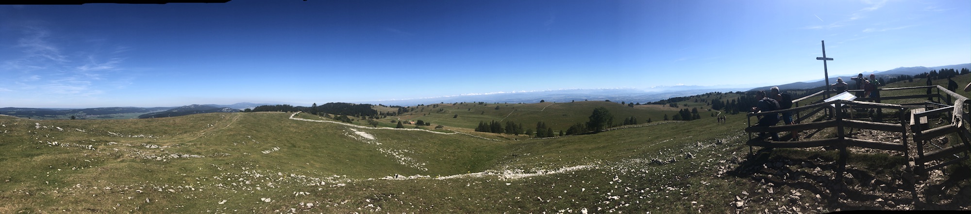 At the trail crossing we chose to take a quick detour up to Le Soliat, the highest elevation but not technically a mountain top, where we were offered yet another impressive view over the alps. The wind was very strong however and we didn’t stick around too long, before heading back down along the stonewalls to the edge of the Creux du Van. From there the trail branched off over the meadow of Grand’ Vy.