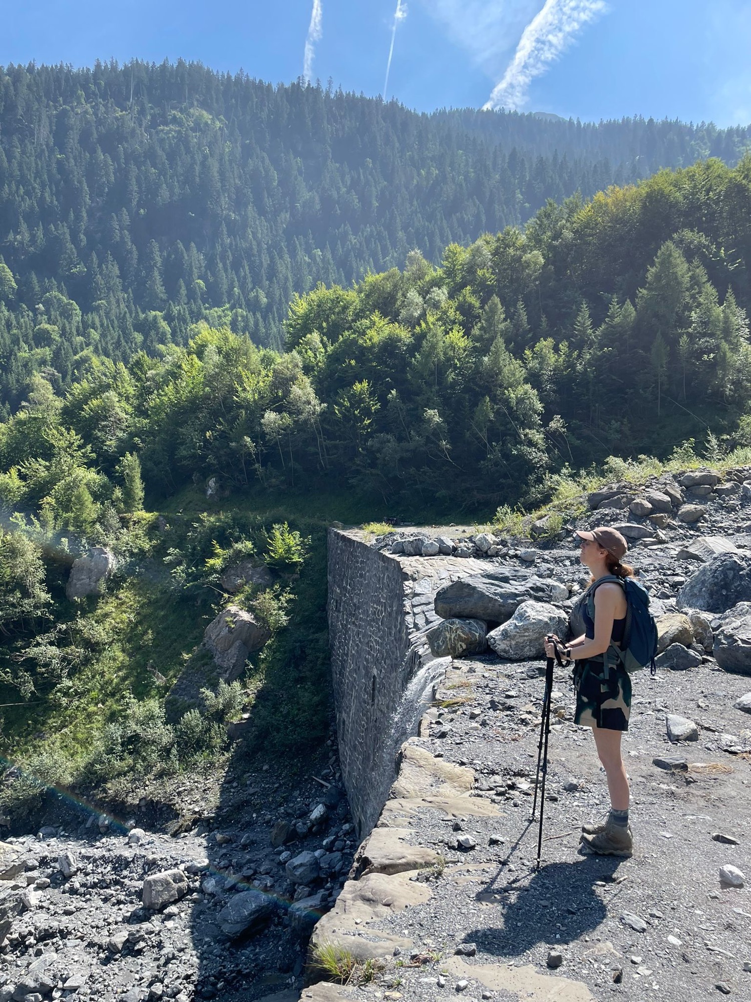 We drove the car to Mex and from there walked out of the village center direction Le Foillet, now still walking on a yellow marked route on a small asphalt road for the first 20 minutes. Shielded from the hot midday sun, we heard the river below us and the rustling of the wind in the braches above us. Soon the trail turned into a gravel road which I much prefer to the asphalt. Not only because it is more comfortable to walk on but also because to me it implies that the real nature adventure is about to start. Water was a constant companion those first 2.5 kilometers; little streams along the path and waterfalls coming down over jagged cliffs, gently dripping off the mossy rocks and then the Torrent de Saint-Barthélemy, a wild stream and a tributary of the Rhône which has its source is at the foot of the Dents du Midi and can be crossed via an overpass.