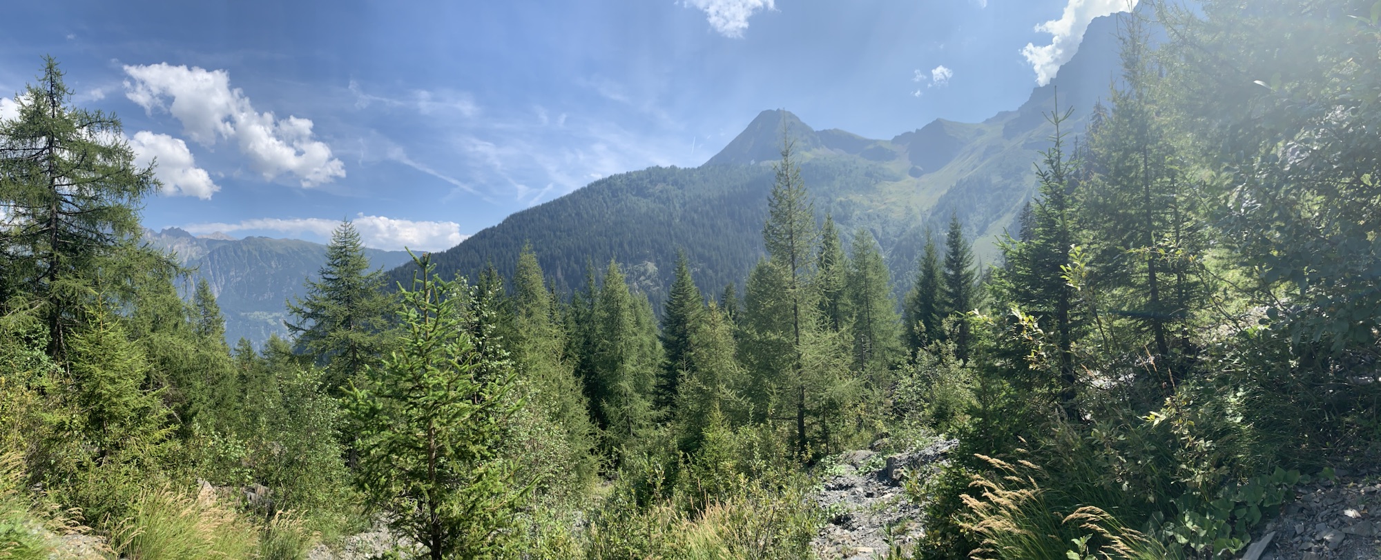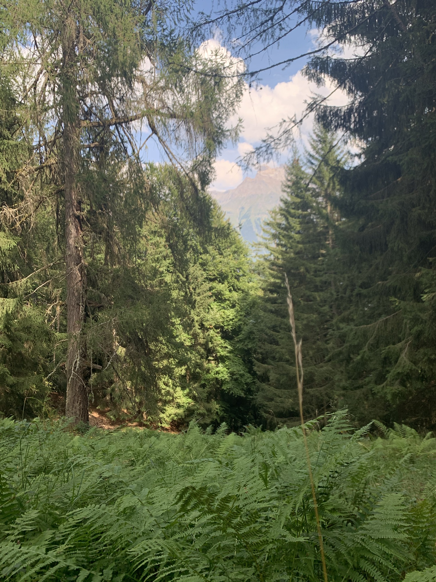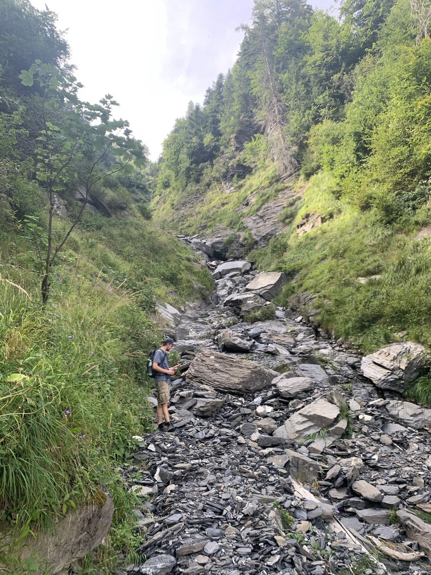 As we walked on, we noticed gradually more slate stone on the trail. It was almost like a stream of stones trickling down the path. We grew increasingly more curious as to where they might come from and we were soon after gifted with an answer. At the foot of the Pointe Fornet at around 1’350 meters – our highest point – we suddenly found ourselves in an rockslide hidden within the forest we just ascended trough. This otherworldly looking field of black slate stone in all shapes and sizes came so unexpected, even though it is ofcourse visible on the map. We carefully ascended further up and every single step led to a series of tapping and trickling sounds echoing into the vastness. And apart from that there was complete silence. No wind, no voices, no sounds carried up from the valley. Just silence and our voices.