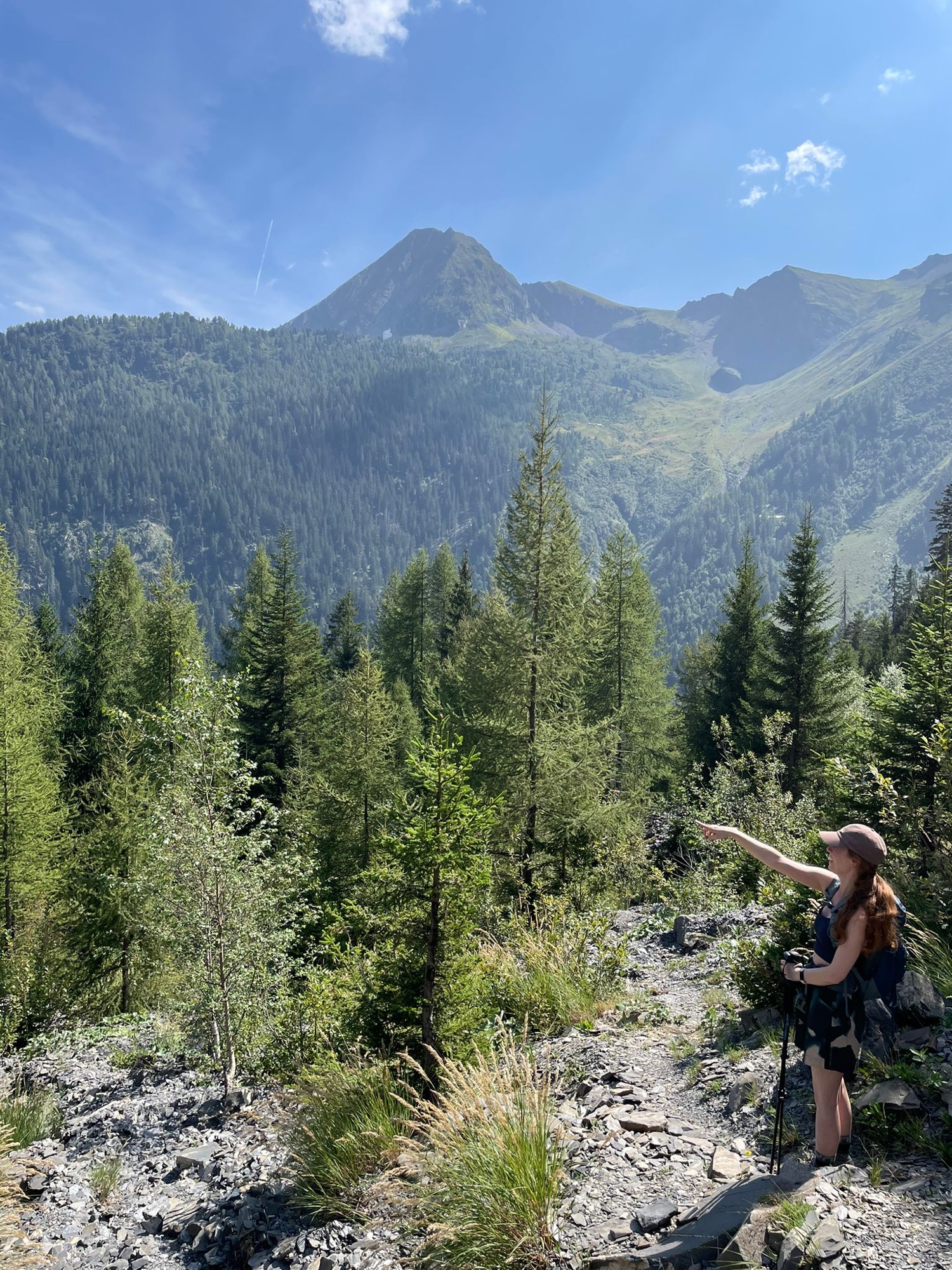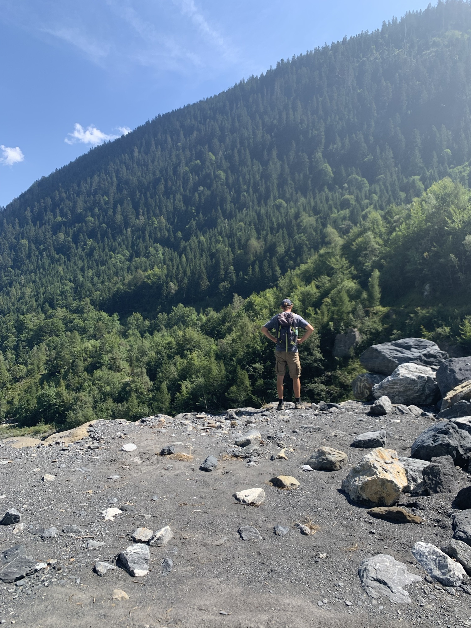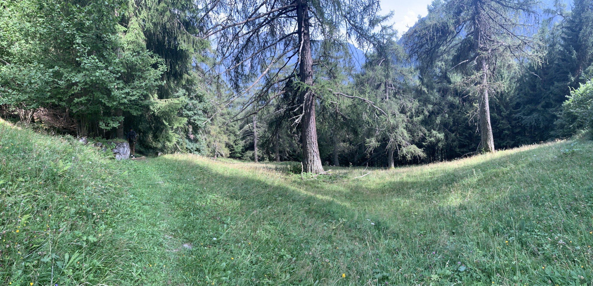 As we walked on, we noticed gradually more slate stone on the trail. It was almost like a stream of stones trickling down the path. We grew increasingly more curious as to where they might come from and we were soon after gifted with an answer. At the foot of the Pointe Fornet at around 1’350 meters – our highest point – we suddenly found ourselves in an rockslide hidden within the forest we just ascended trough. This otherworldly looking field of black slate stone in all shapes and sizes came so unexpected, even though it is ofcourse visible on the map. We carefully ascended further up and every single step led to a series of tapping and trickling sounds echoing into the vastness. And apart from that there was complete silence. No wind, no voices, no sounds carried up from the valley. Just silence and our voices.