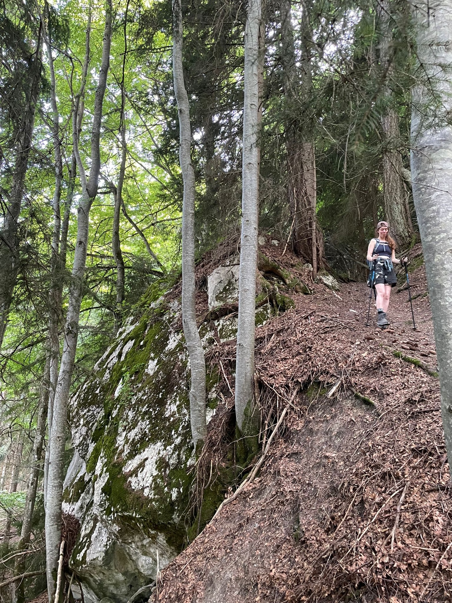 After successfully traversing the stone field without triggering an avalanche, we re-entered the forest, passed resin trenched trees and impressive sculptural moss covered slate stones and inhaled the scent of sweet needle trees and damp moss. Every step filled me with more reassurance that I will finish this hike safely and proudly.