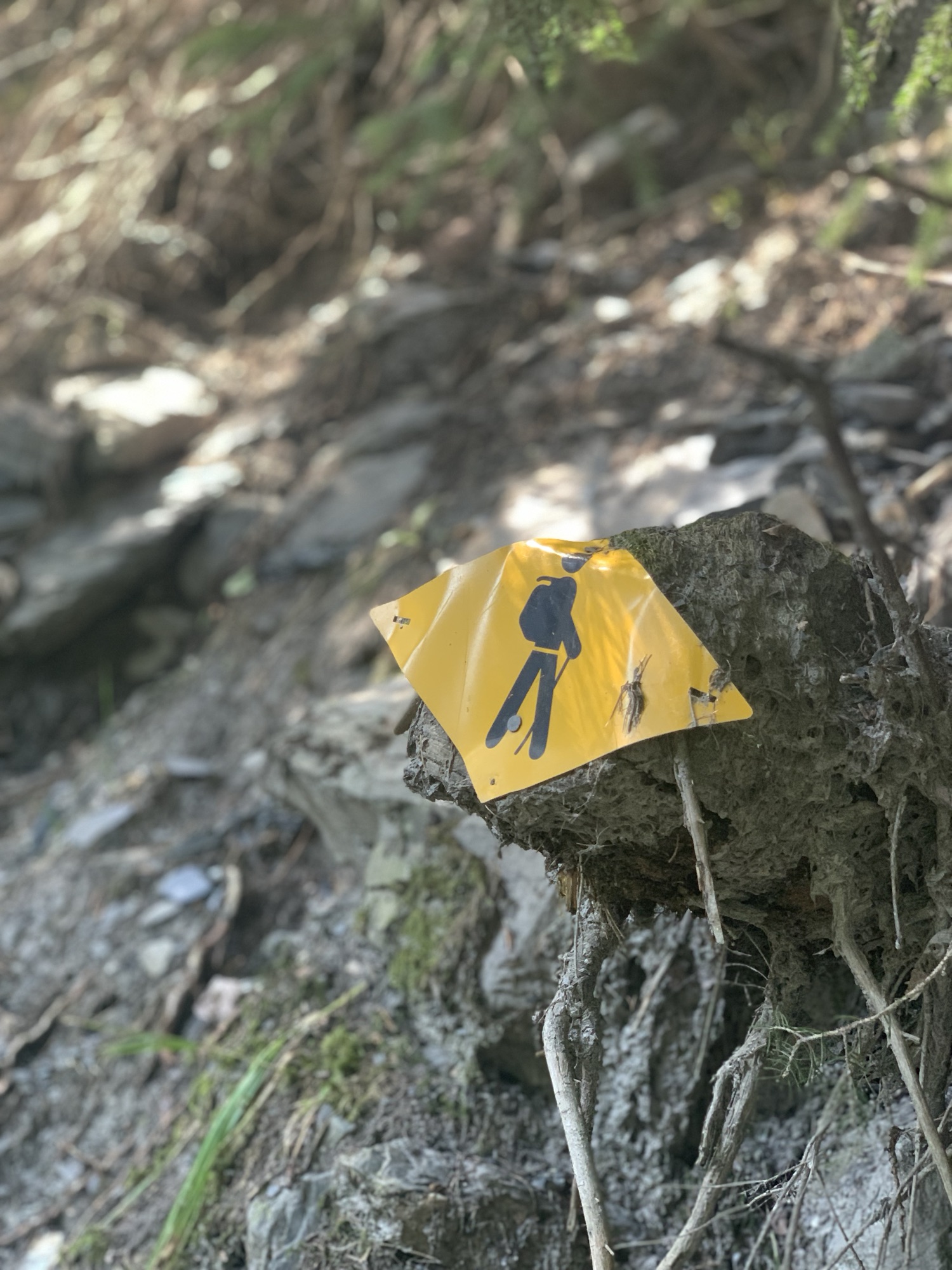 Even though we saw the bright yellow waypoints in the distance, there was no clear path over the field of stones and it involved some scrambling to cross over. But the slope is not too steep, there are many trees and therefore it is really not a challenge in terms of height. It is however smart, to go slowly, as the stones might not be stable or stuck and slip away under your feet.