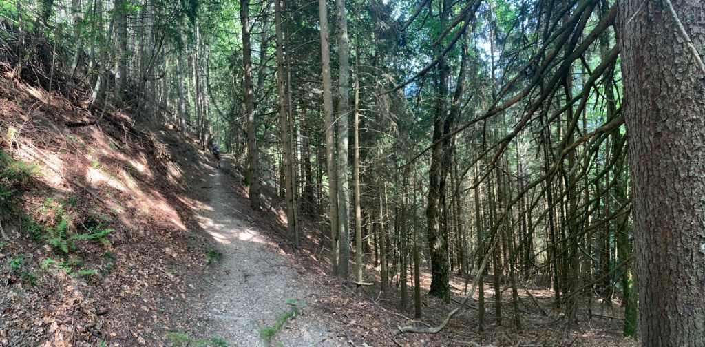 There were times where the path became very narrow and barely visible in the thicket. It definitely asked for care and sure-footedness, sometimes not even both feet fit next to each other. And yet, most of the time I didn’t feel nervous or uncertain of my abilities to walk this trail safely; the presence of the many trees surrounding us and creating almost a kind of cradle was much appreciated. And whenever I remembered that I was climbing up and leaving the solid ground below me, I just looked ahead of me or turned my gaze up to the sky; because the sky always looks the same and the fact that it ultimately starts to feel closer never scares, but rather excites me.