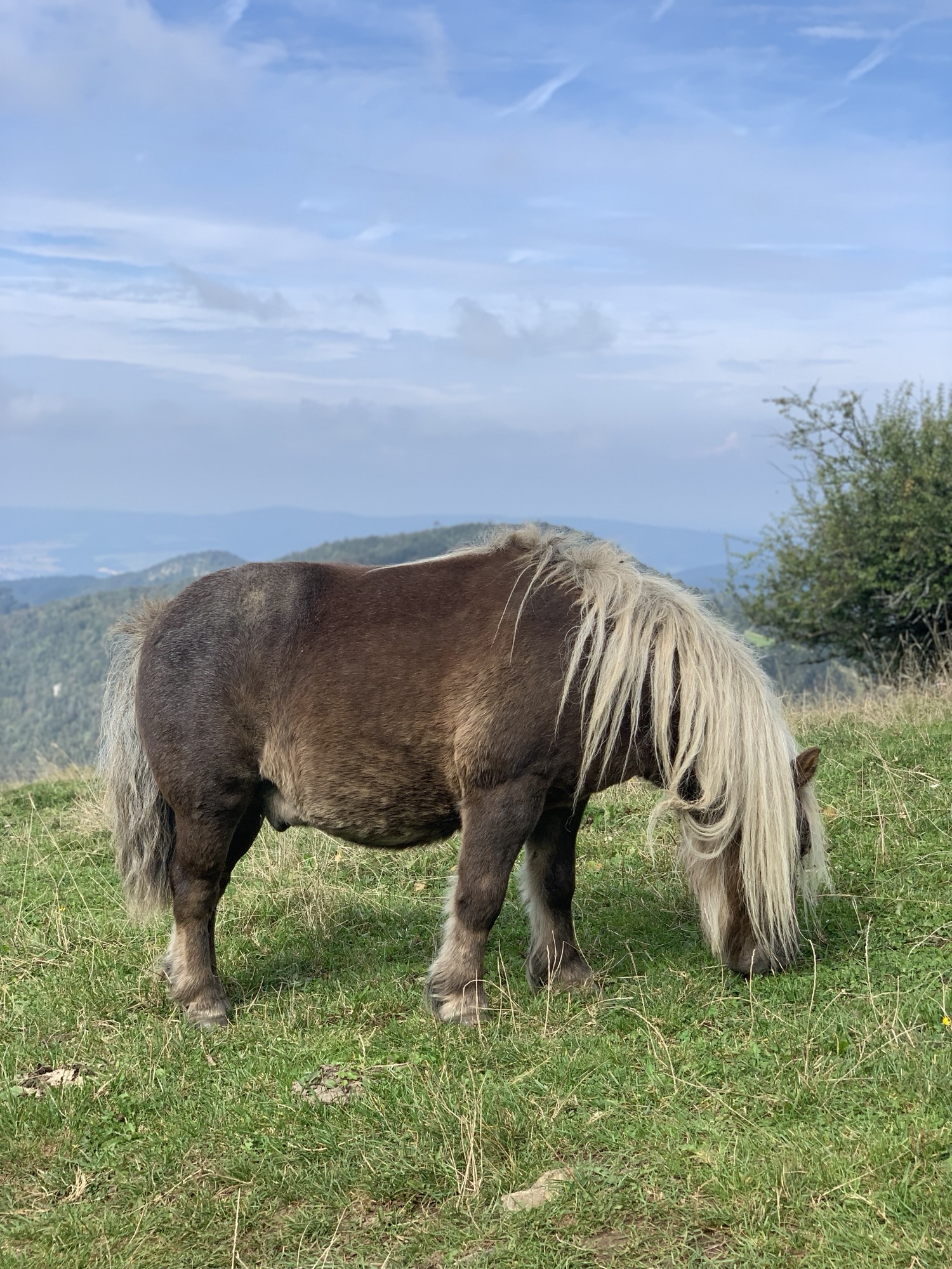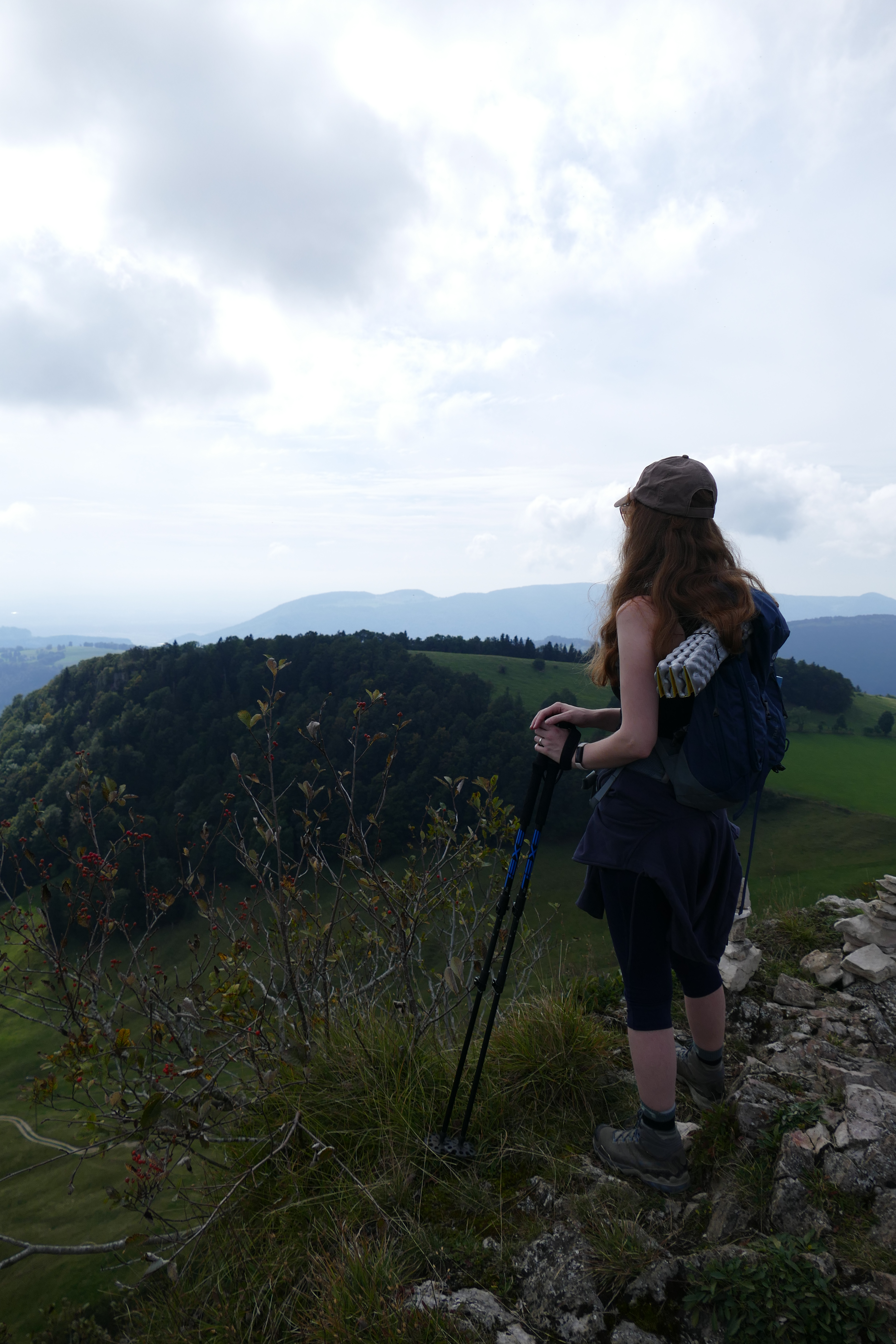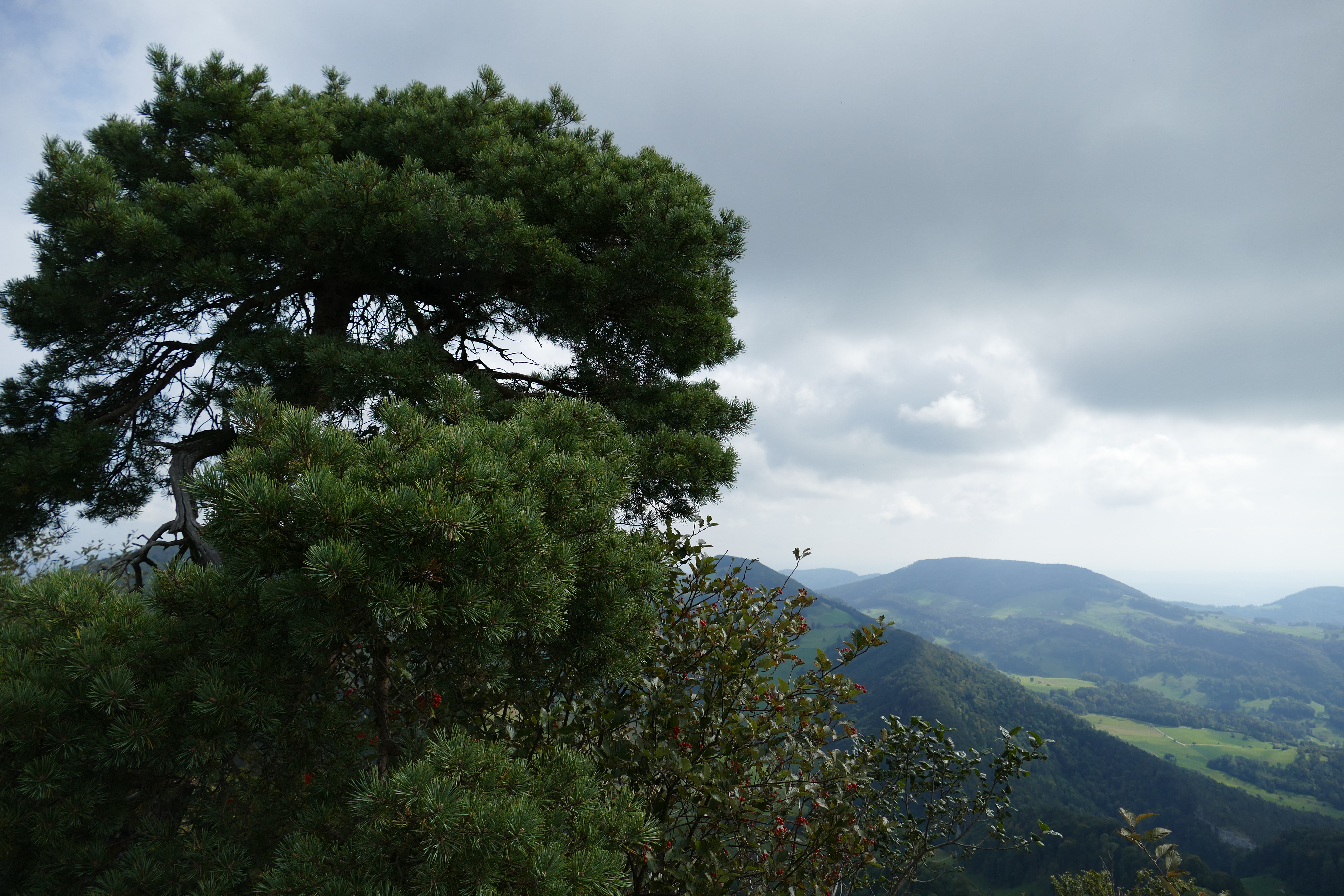 After climbing a bit more upwards, passing a little group of contently grazing ponies, we already reached the peak of Vogelberg at a 1200 meters. The rocky formation offers some space to sit and admire the view, if you’re lucky all the way to the Alps – the Eiger, Mönch, Jungfrau and even the Mont Blanc. Sadly on that day it was a bit to hazy in the distance to get a clear view, but breathtaking nonetheless. Shadows floating over the lush green fields, rolling hills and patches of thick forests under an “alive sky” as Sam and me always call it. I might have mentioned this before but my favorite skies are not the clear blue ones but the ones that move; that can change in a second from a dark grey to a light blue.
