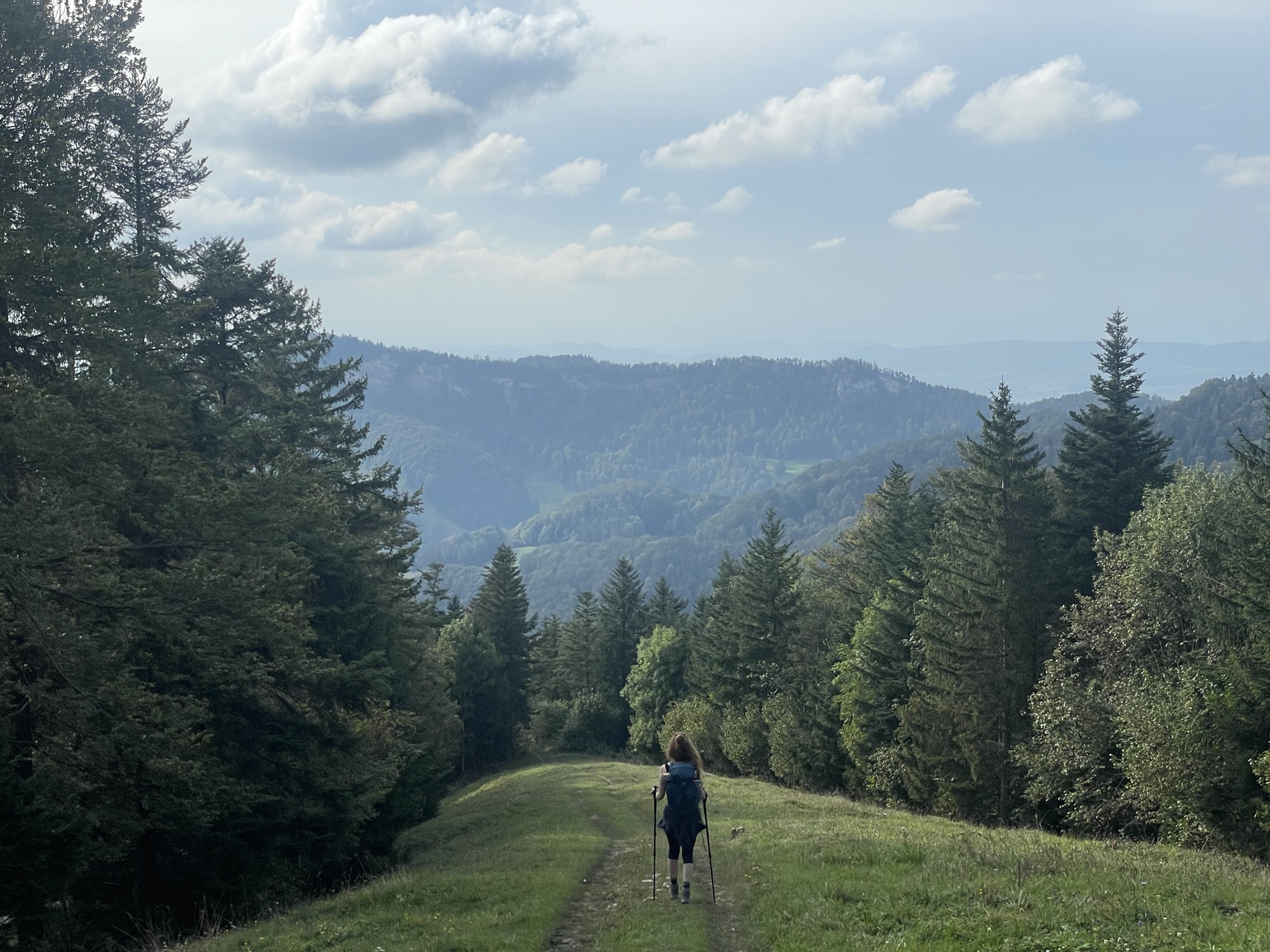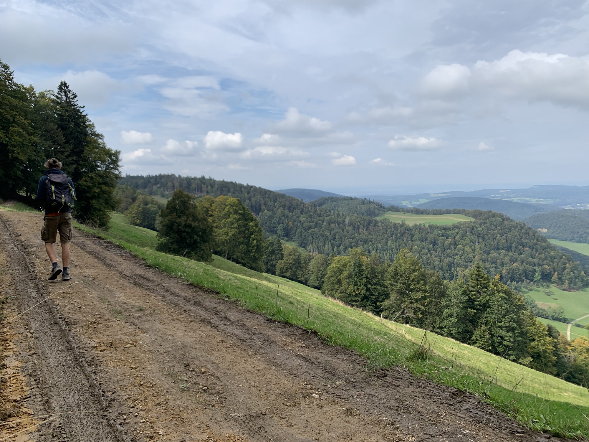 A sharp bend to the left and a short ascend via the Chleiweidli later we crossed the ridge of the Shattberg. We walked along the edge of the forest and soon after reached the Graubode, a meadow inhabited by curious grazing cows and a vast view over the rolling countryside of the Baselbiet. We left the green marked hikingroute behind us, following trail over the field into the woodland. A little forest hut and a bench with a view provided us with the perfect stop for an afternoon coffee.