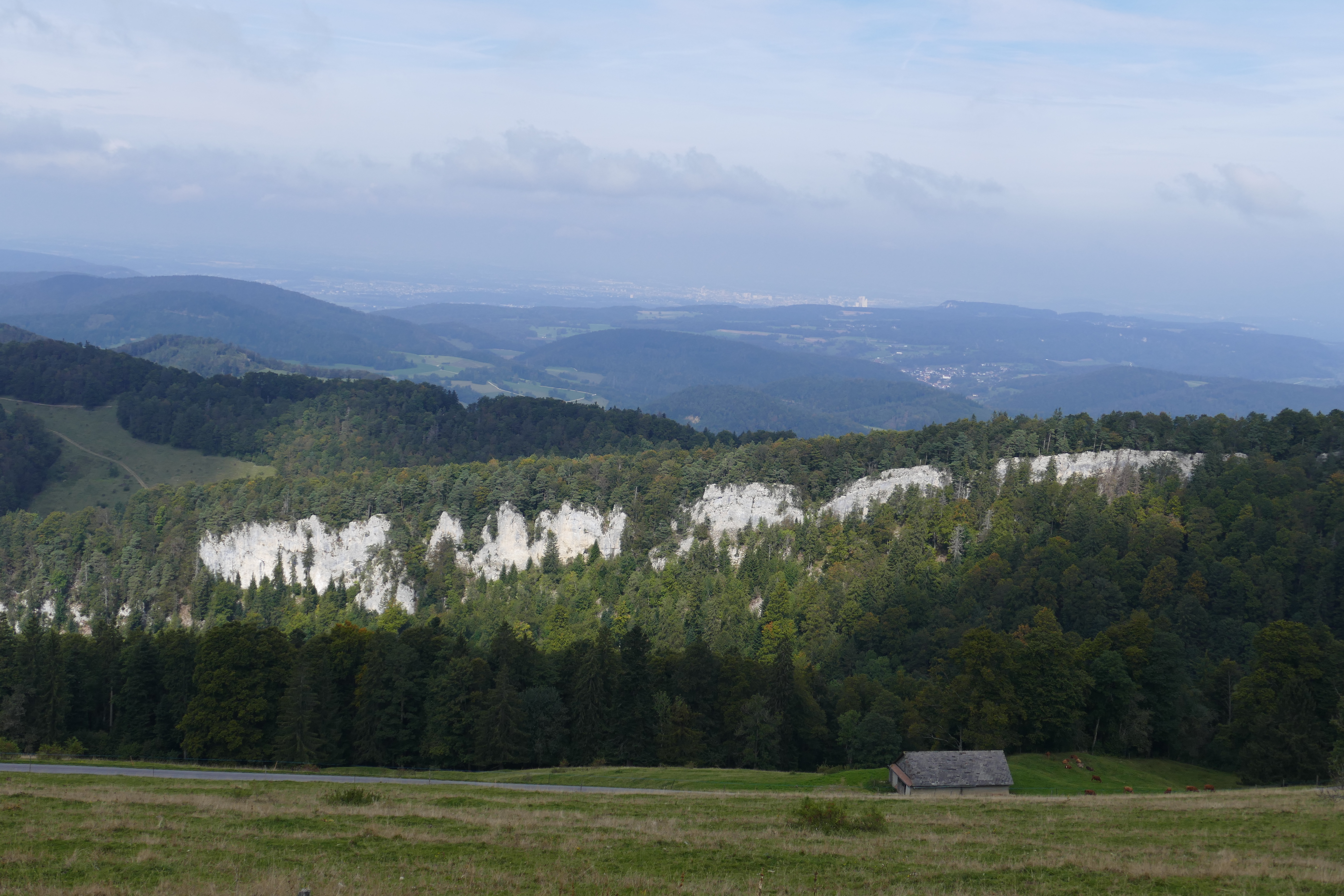 Back down on the right path, which involved no more climbing luckily, we made our way back towards the parking space on a small asphalt road, the impressive triangular shaped rockwall at the Passwang appearing in our sight.