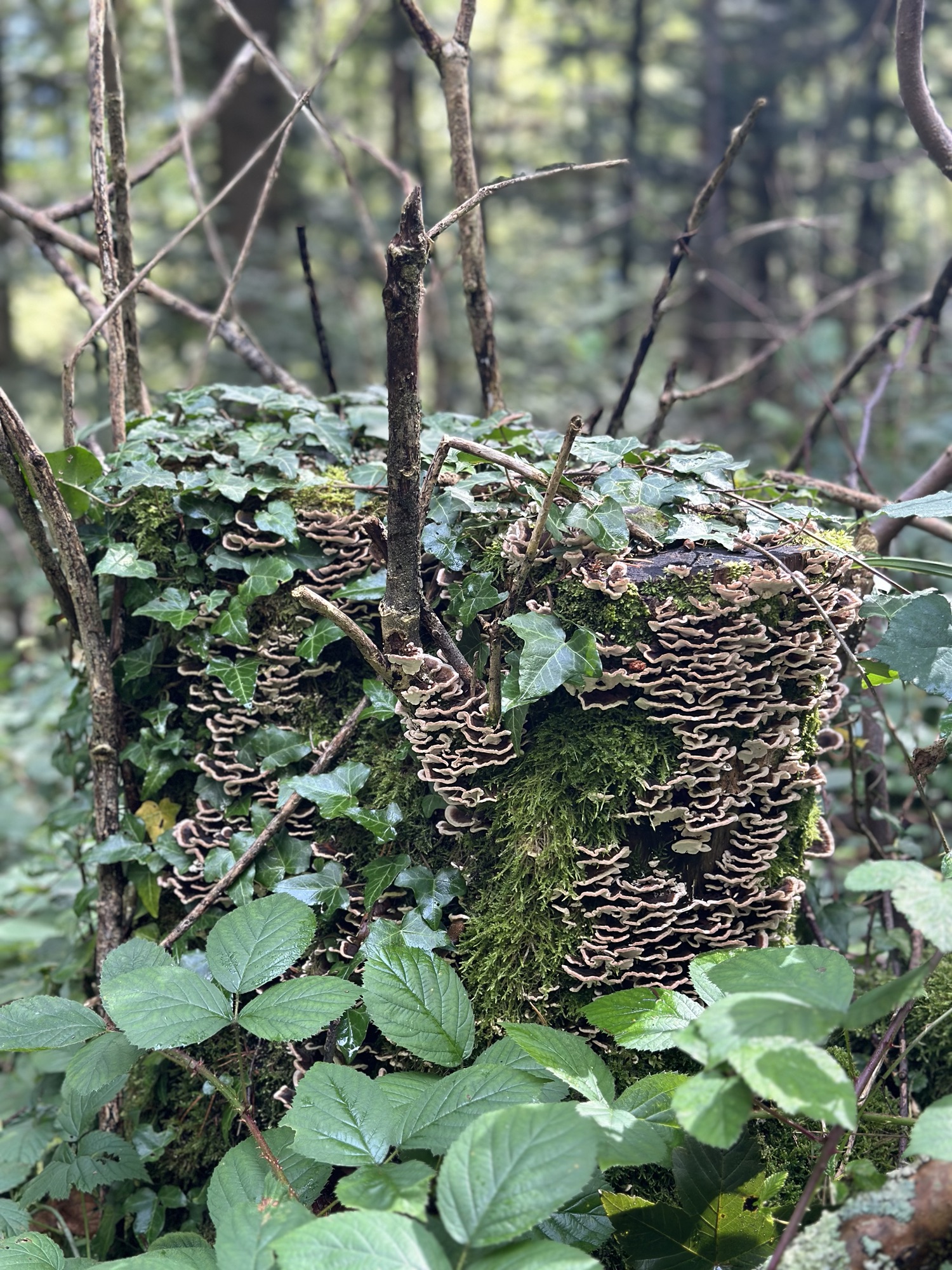 The forest floor was littered with various mushrooms, branches with glowing red leaves and soft lush green moss. We started to slowly descend until the path took a sharp right turn off the ridge and into the Stierenbergweid, a peaceful meadow between the forest and beneath the rocks we had just crossed.