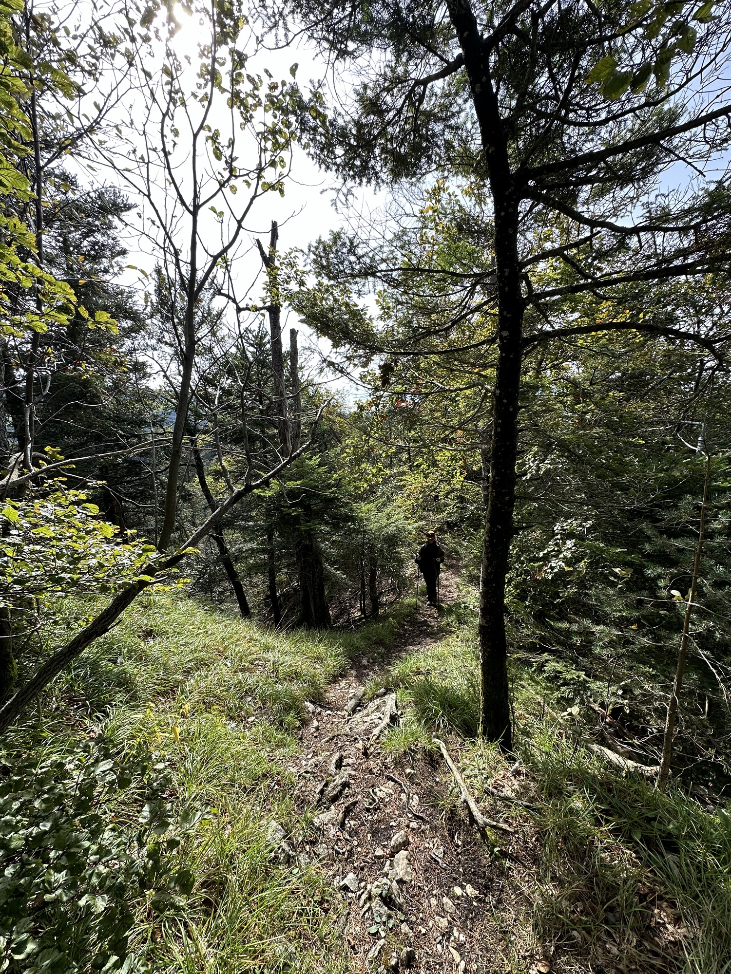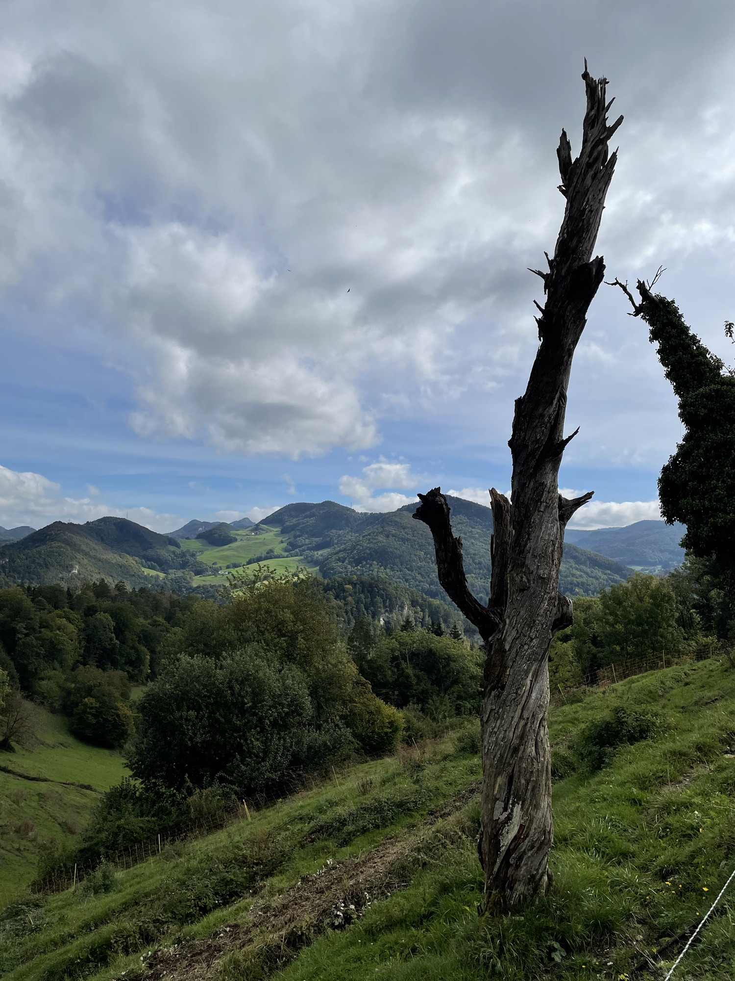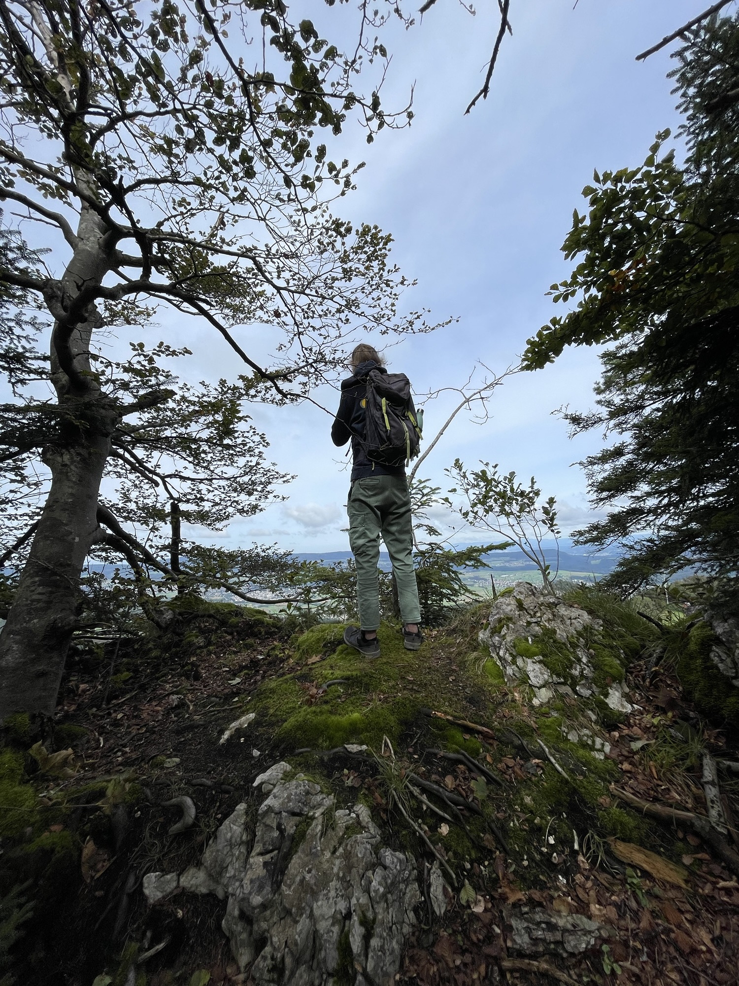 Having passed the farm at Oberbergli, we started our short climb up to my favorite meadow Gringel and the often passed Welschgätterli. From here we began walking right on the border between Solothurn and the Jura; I don’t know which side we were officially on and of course it didn’t really matter to us. All that mattered was the narrow rocky and adventurous trail ahead of us, guiding us over the ridge of the Stierenberg in between the impressive stoic trees, all the while offering glimpses in between the tree branches into the far distance. While narrow and leading over the backbone of this approximately 900 meter high mountain, I didn’t really face any challenges in terms of height or exposedness. That being said, it is one of the more daring hikes to attempt with a fear of heights. In a few places there are rock walls falling off on one side but it can absolutely be avoided to stand close to the edge, which makes it possible to enjoy this daring section.