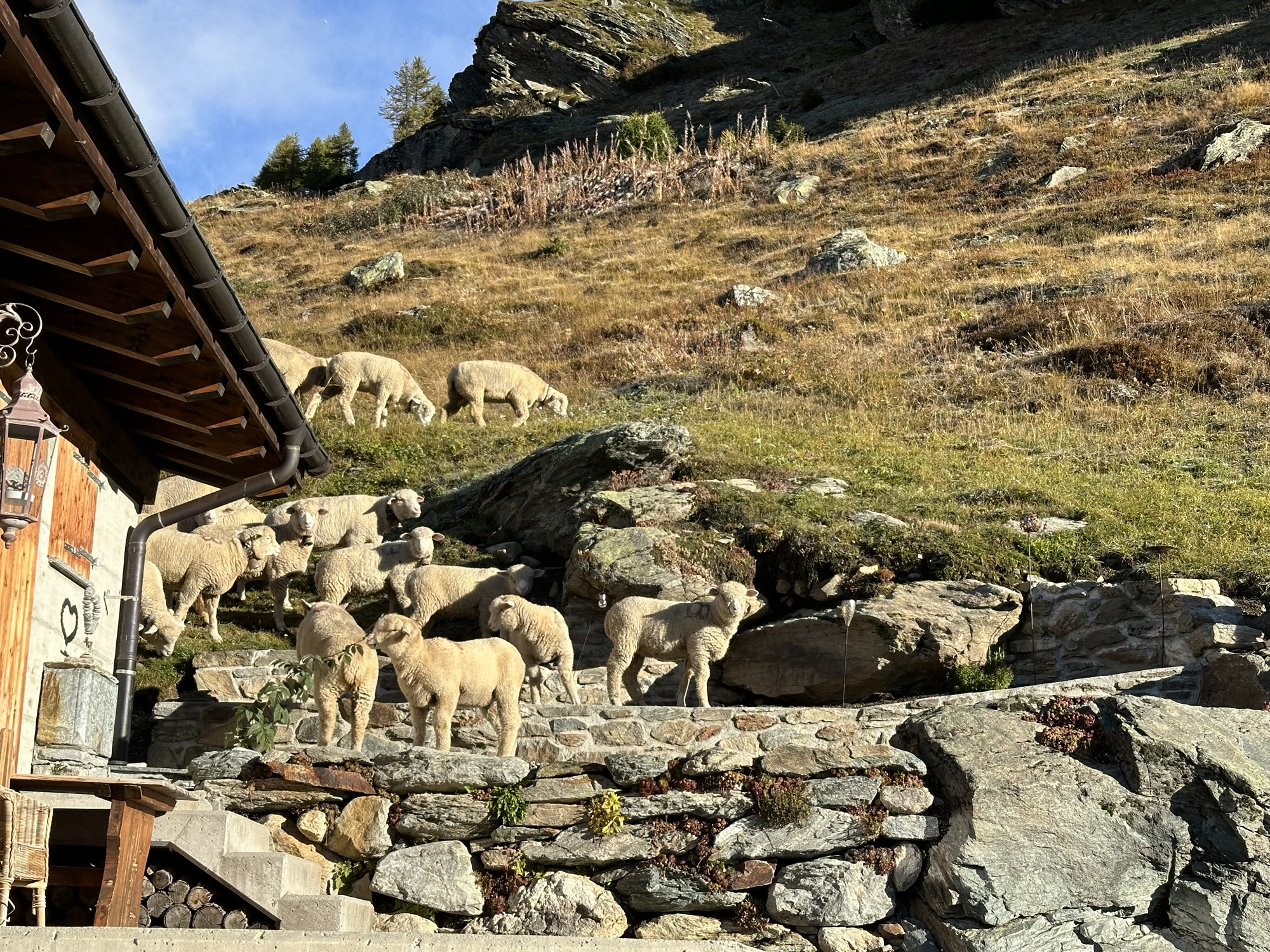 The frost on the grass crackled under our steps and shimmered in the first sunbeams, appearing behind the mountain range. A short but steep climb marked the beginning of our hike up to Stafel, where we would meet the Lötschberg Panoramatrails fourth section. We had a breathtaking panoramic view over the mountains across: above all the almost 4000 meter high Bietschhorn.