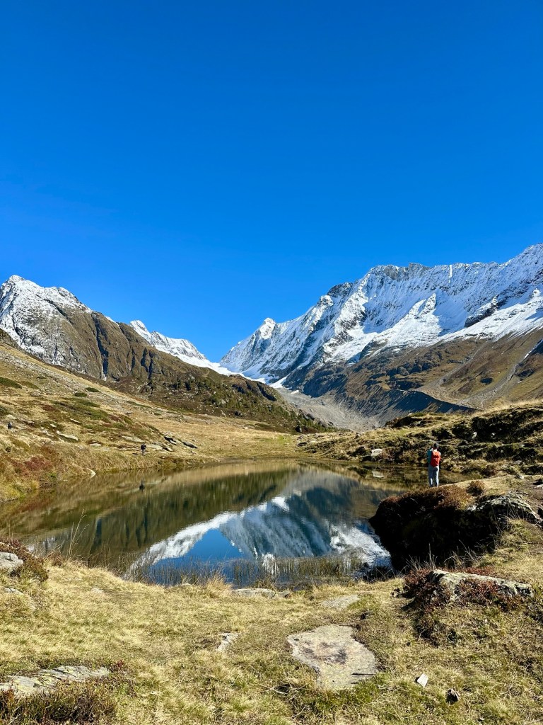 We passed countless glacial erratics: large stones that were transported through the glaciers during the Ice Age. And about 20 minutes before our hiking destination we reached the last lake of the day: the meltwater lake Grundsee. The emerald green water was crystal clear and the stones laying at its bottom seemed almost covered in gold; a natural treasure for sure. Being so close to the hotel at Fafleralp, it was visited by many strollers, who enjoyed the serene atmosphere while enjoying the afternoon sun, read a book or watch their kids play at the lake. It was clear that we had slowly but surely reached more civilization again.