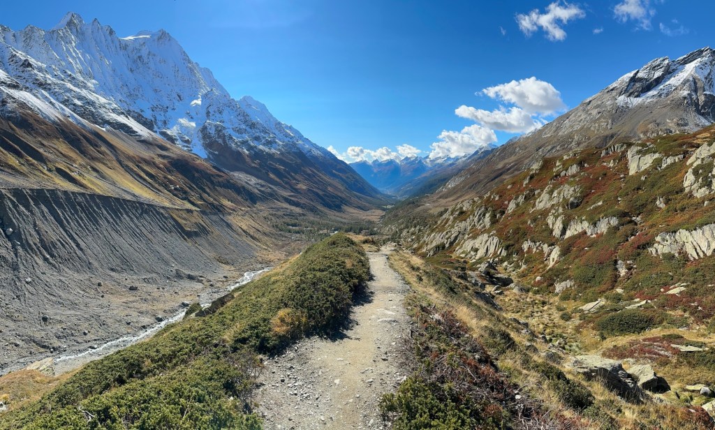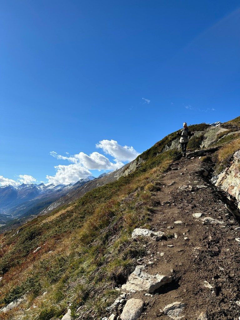 After our lunch we started the descent and last section of our hike. We followed a wavy trail next to the edge. This is where I experienced some challenging moments but the view truly made it worth to endure those; the river Lonza winding its way trough the valley was another magical sight.