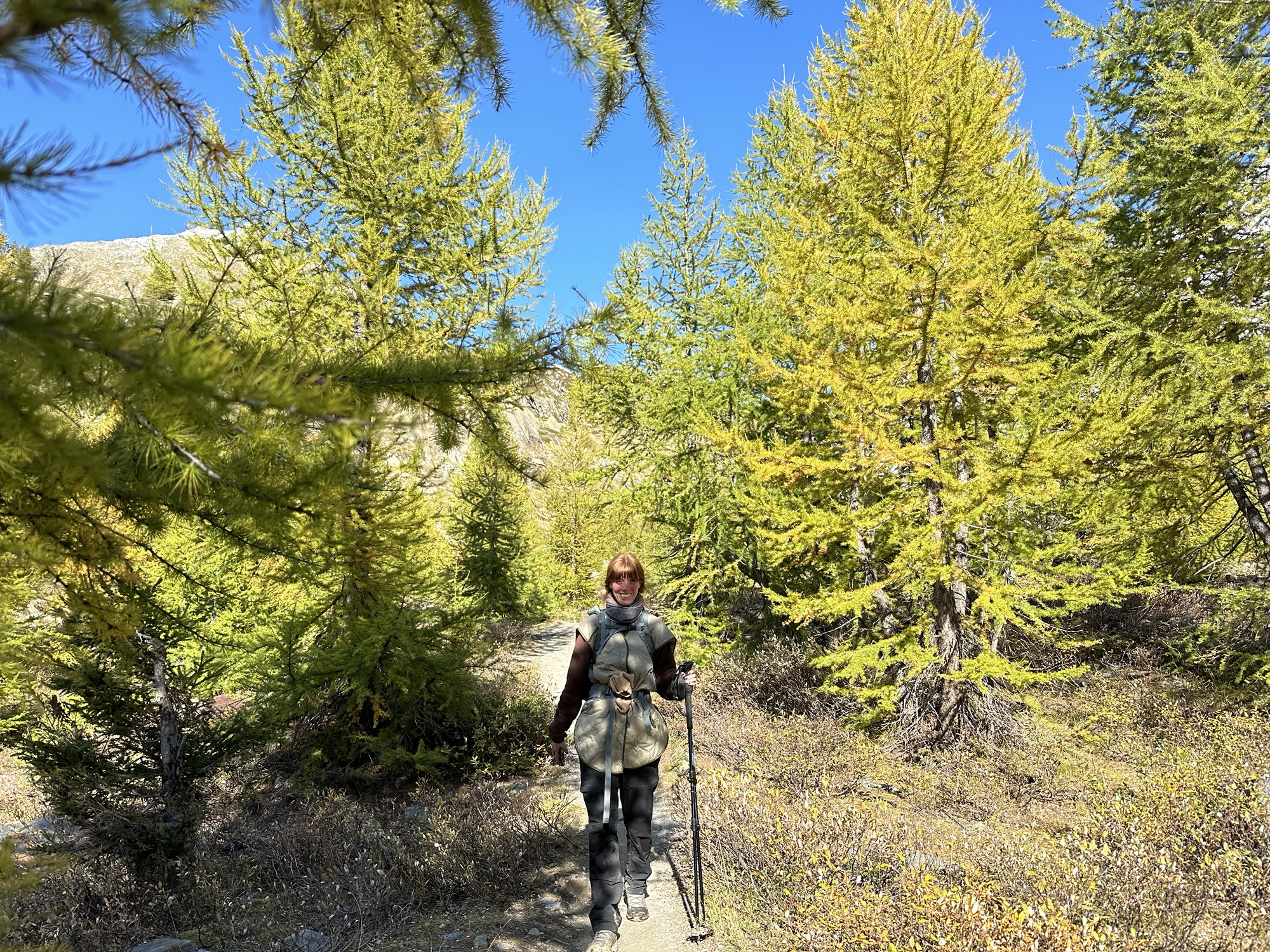 We entered the forest, and were surrounded by the larches whose needles already started to turn yellow. What we learned is that the valley actually received its name from this ancient tree: the place name “Lötsch” indicates the presence of larch trees. The larch came to the alps over a million years ago from Siberia and under the given circumstances here in Switzerland they can grow up to 54 meters high and live to over 1000 years. Next to mountains, trees have a similarly awe-inspiring presence in nature. And it felt wonderful to be surrounded by them.