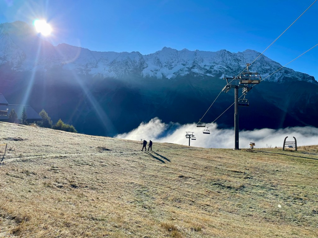 We parked our car in the village of Wiler right at the cable car, bought ourselves a coffee and a croissant and got in the cable car with other eager hikers. Slowly making our way up the mountainside, still laying in the shadows. Upon getting out, we were greeted by a biting cold air that lead us to immediately put on all remaining layers of clothing that we brought with us.