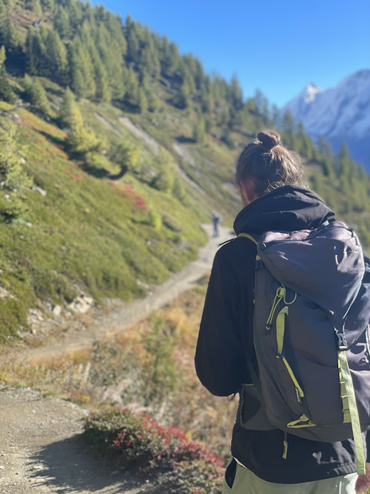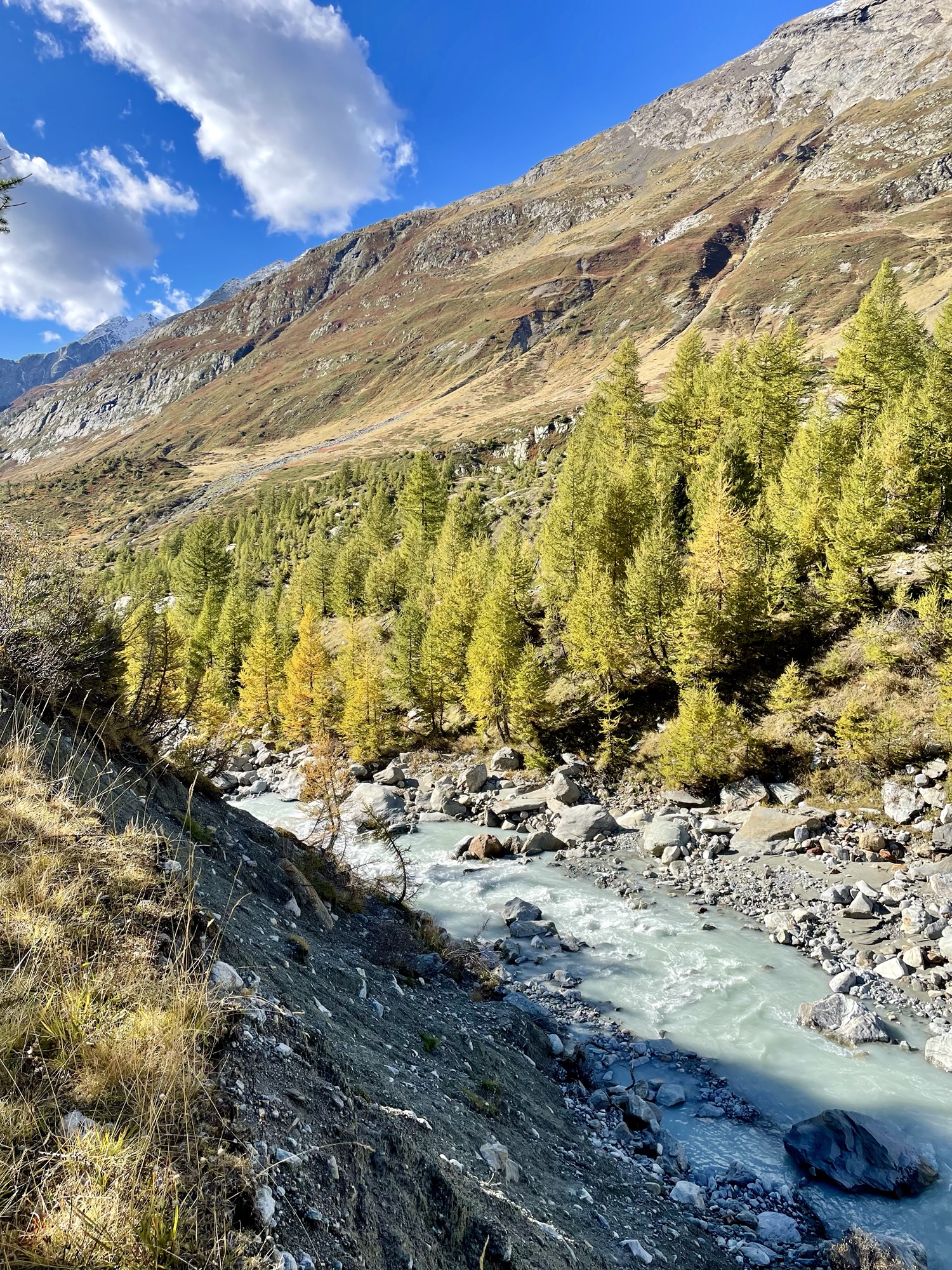We reached the valley and for the remainder of the very gentle descent, we got to walk next to the river and still got to see some beautiful yellow larches, showing off their bright colors against the silvery blue water and the white rocks. It filled me with so much happiness to encounter more of those much awaited yellow trees. After such a strenuous ascent it felt very rewarding to get to just walk straight ahead on almost even ground. And the flowing body of water helped to move us onward.
