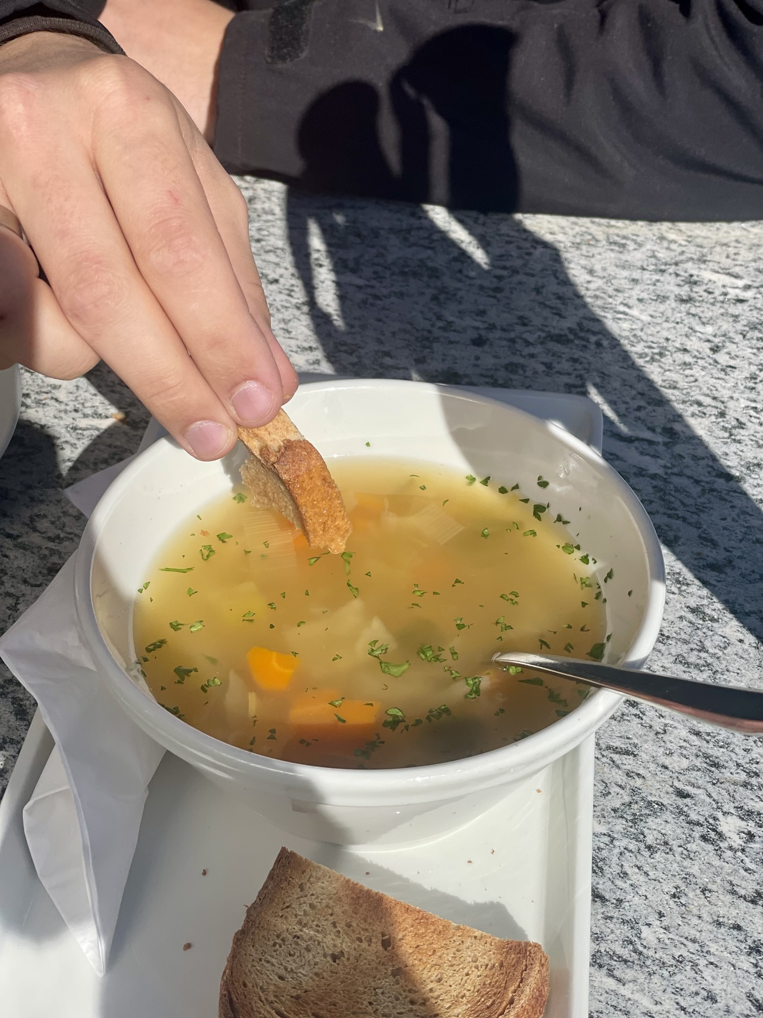 There was no better reason than this view, this amazing location to enjoy a lunch. We ordered a vegetable soup, a piece of apple pie and something to drink. It was exactly the right kind of simple nourishing food this day called for and Sam slowly could regain some energy. The fresh air, the cheerful chatter of the other people and one little lone yellow butterfly, which fluttered over the guests’ plates stayed so warmly in my memories.