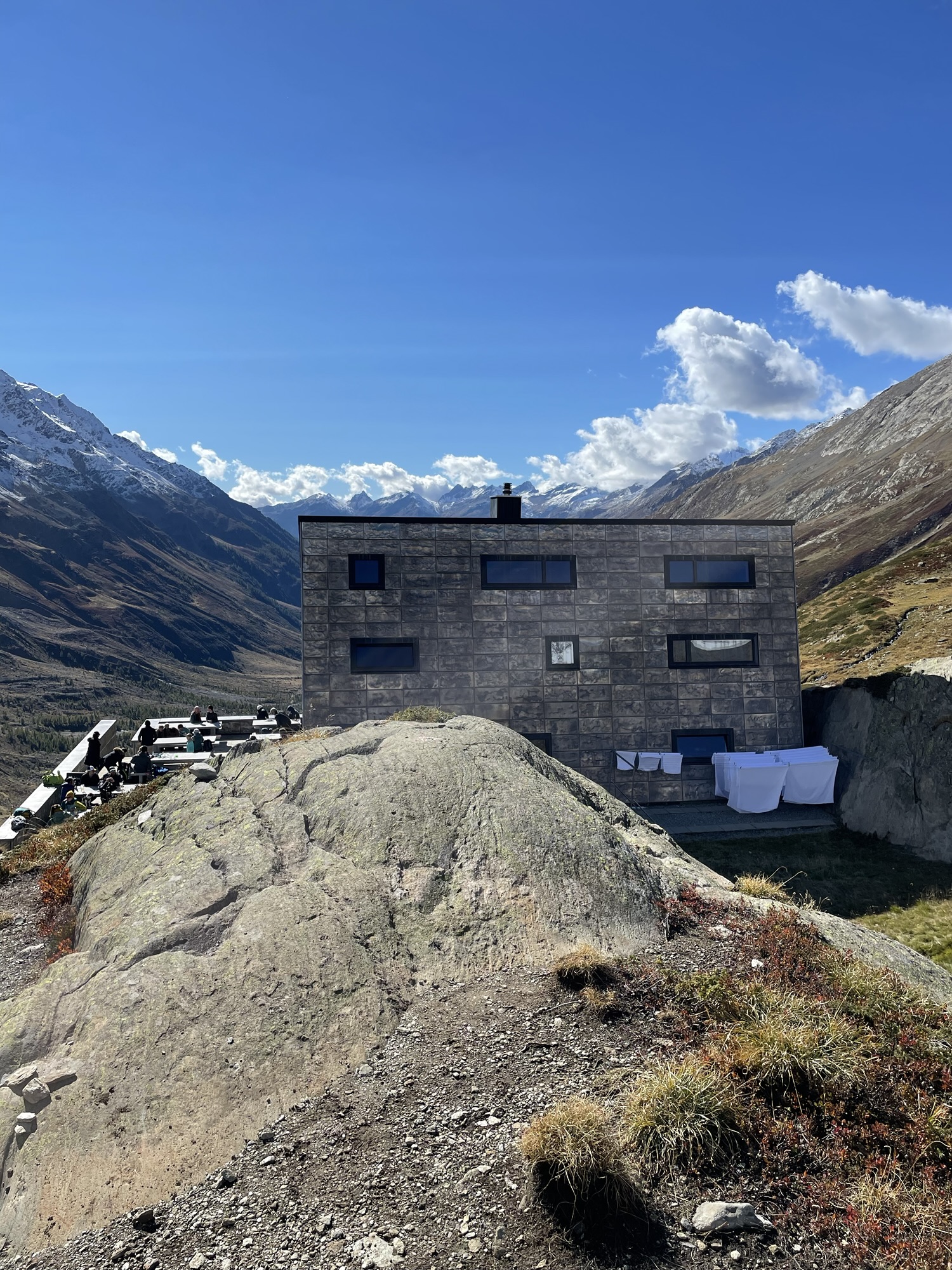 The Anenhütte was first built between 1993 and 1995 with 50 sleeping paces. After being completely destroyed in 2007 by a dust avalanche, the Anenhütte was rebuilt despite some dissenting votes which luckily didn’t hold enough power. The hut is located outside of the construction zone in the middle of a Unesco World Heritage Site so the conditions for a rebuild were extensive and the care that went into the design is very noticeable. The modern looking construction (which was chosen to deflect the forces and assure no projections) fits seamlessly into the rustic, mystical surroundings. It was absolutely noticeable that the builders were aware that no modern achievement could replace the fascination and attraction that the mountains and nature up here have.