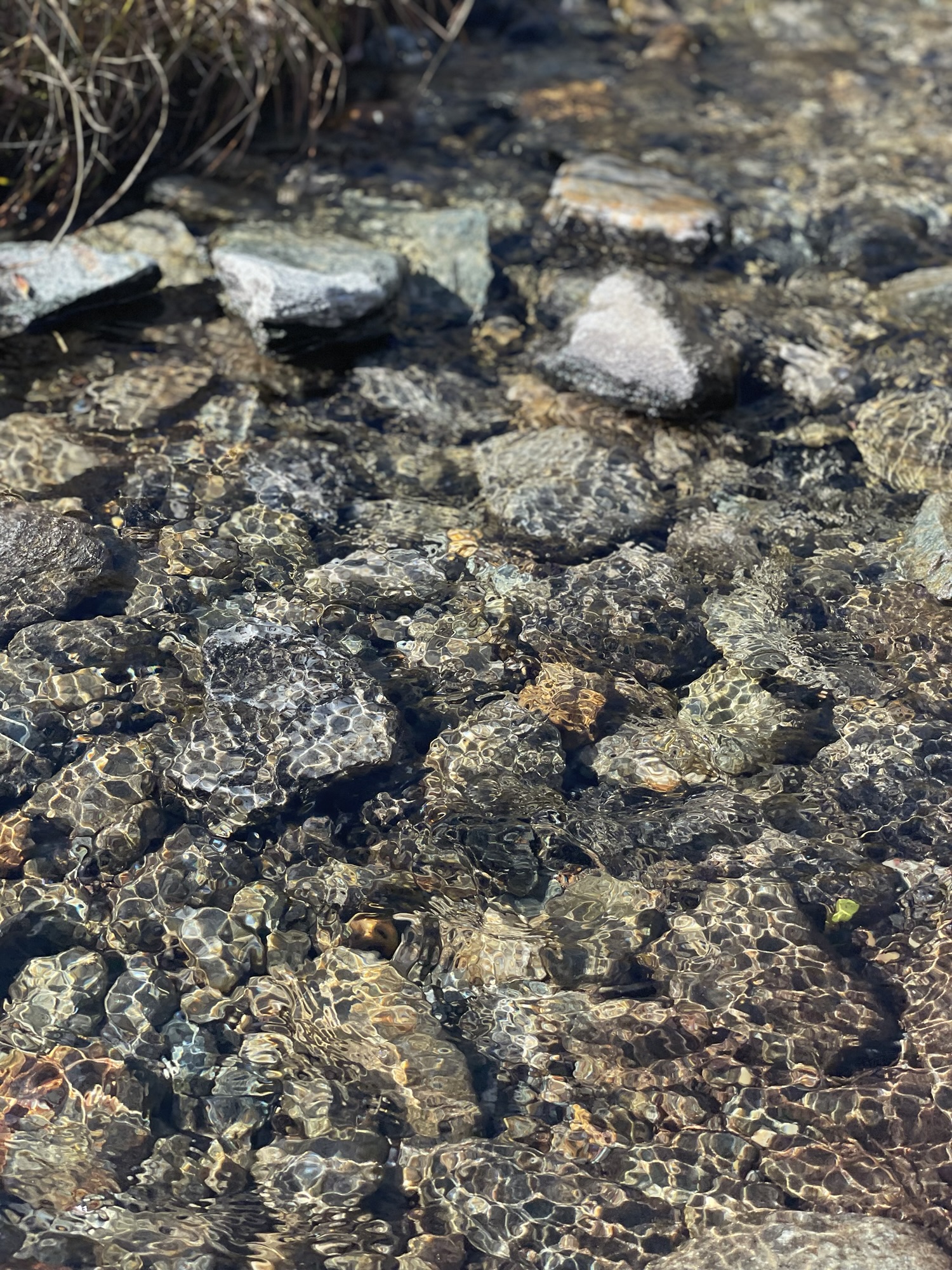 Even though not fully above the treeline yet, we left most of the trees below us, slowly entering a different more “barren” landscape. I put that in quotes, because I associate barren with desolate or bleak and this landscape was anything but that. Colorful bushes lining the path, lichens, moss, little riverstreams meandering through the fields glittering in the sunlight and the endless mountain chains covered in snow surrounding us.