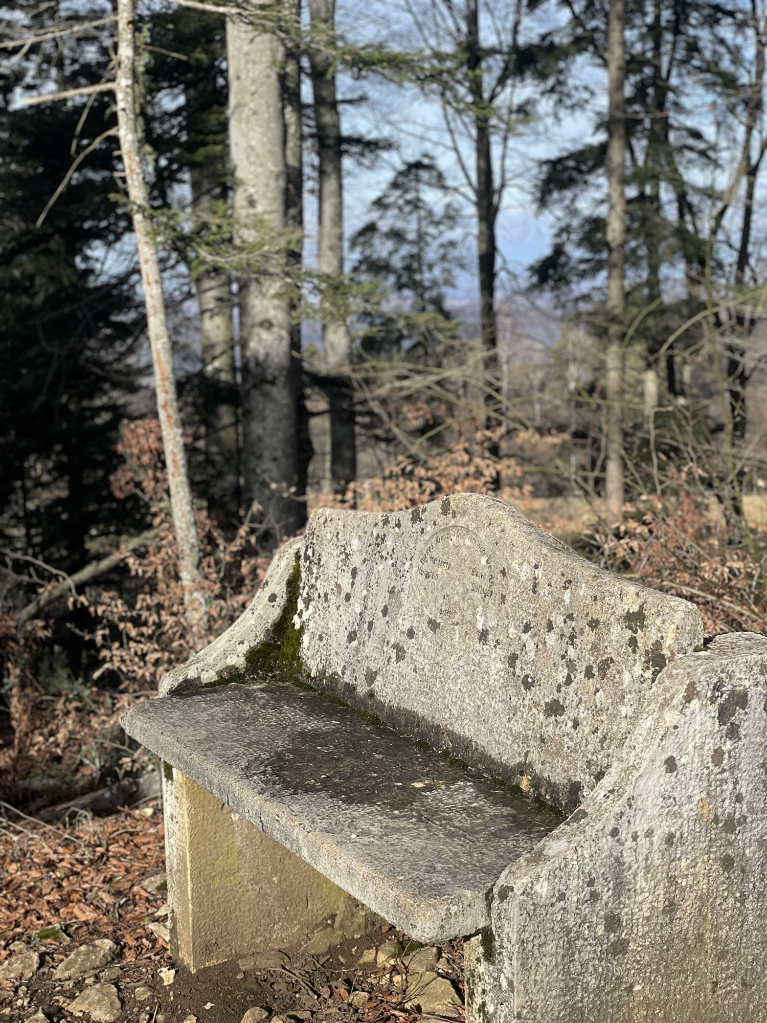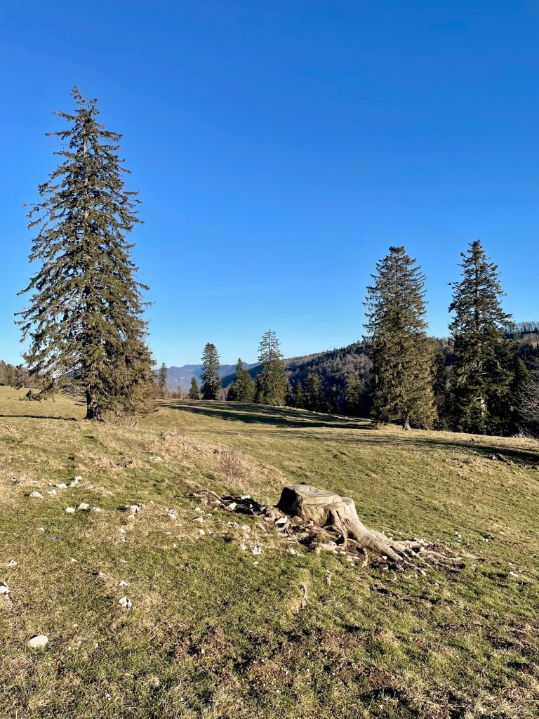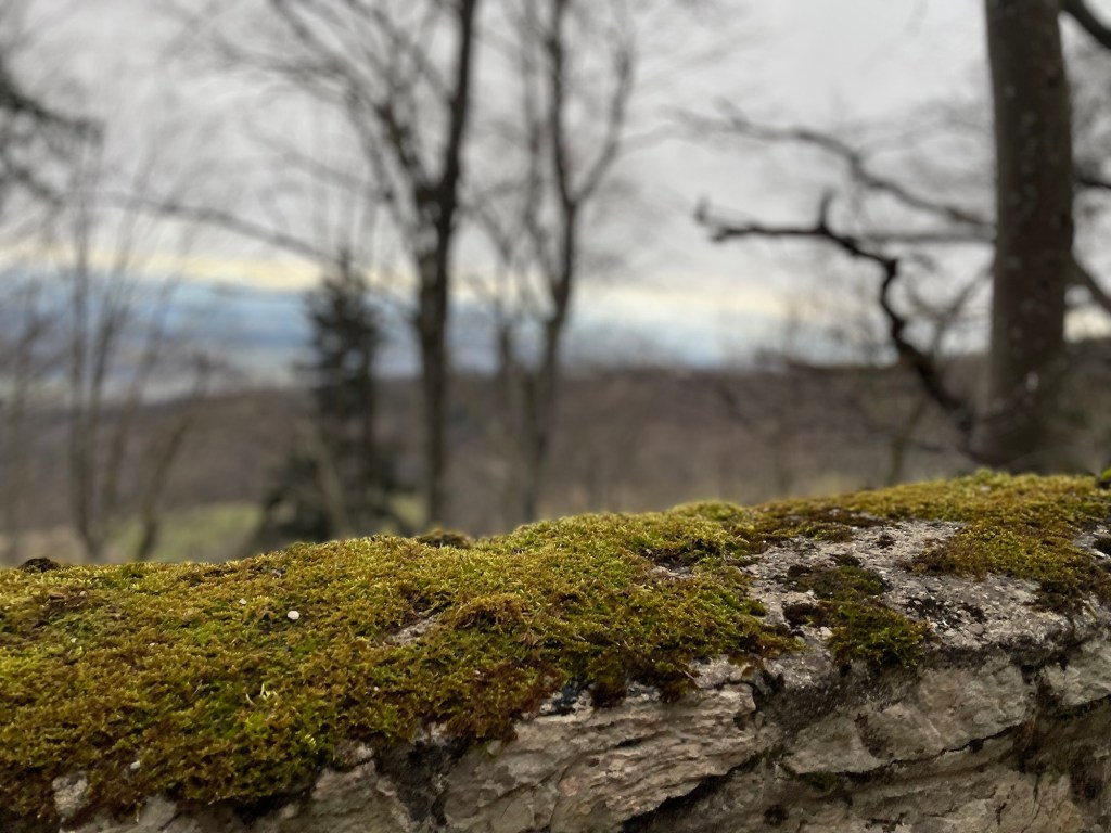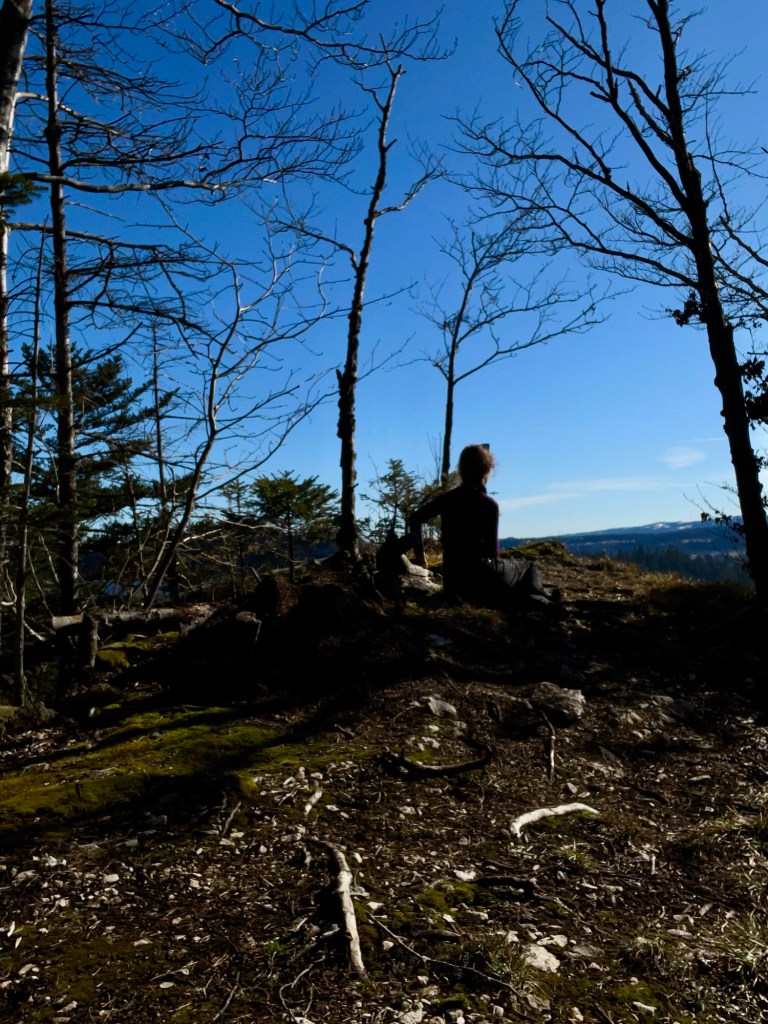 The light in Winter and early Spring is a different one I keep noticing; it is more ethereal than in Summer or Autumn. On this day, it almost felt, as if everything was wrapped in a thin blue veil. And yet the sun rays warmed my face, while the herbal tea warmed up my body. Eager to continue my hike along the ridge, I packed up my things and started walking with my poles frequently thumping against the many big roots that winded across the path.