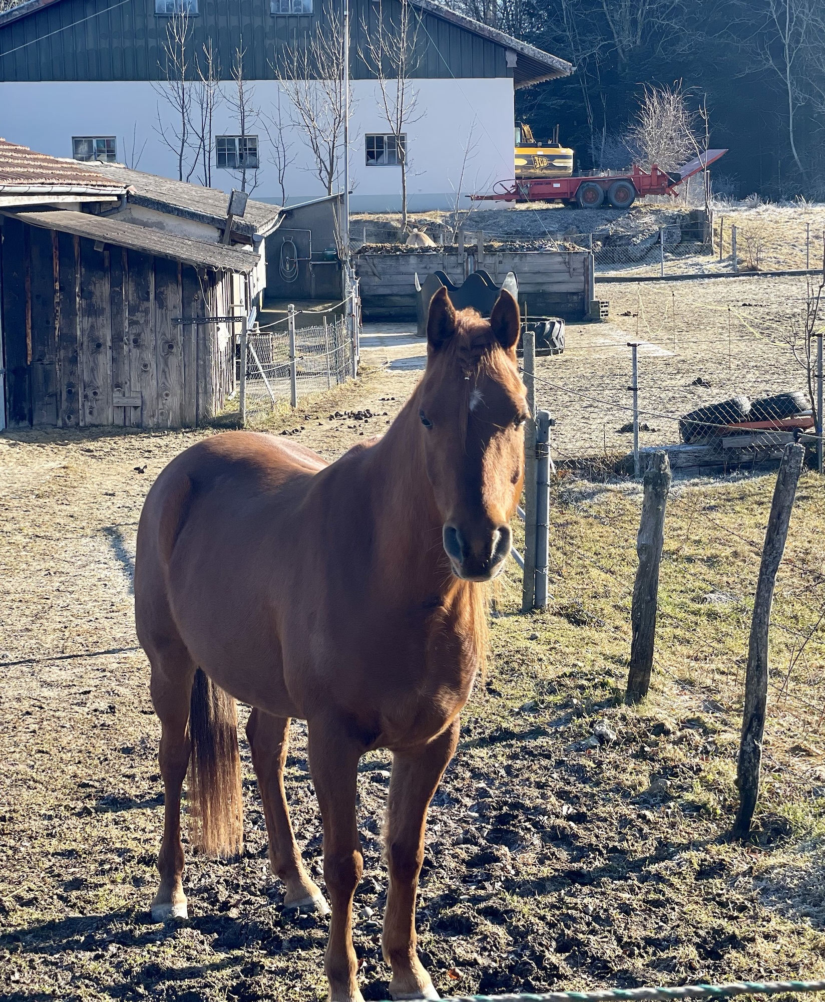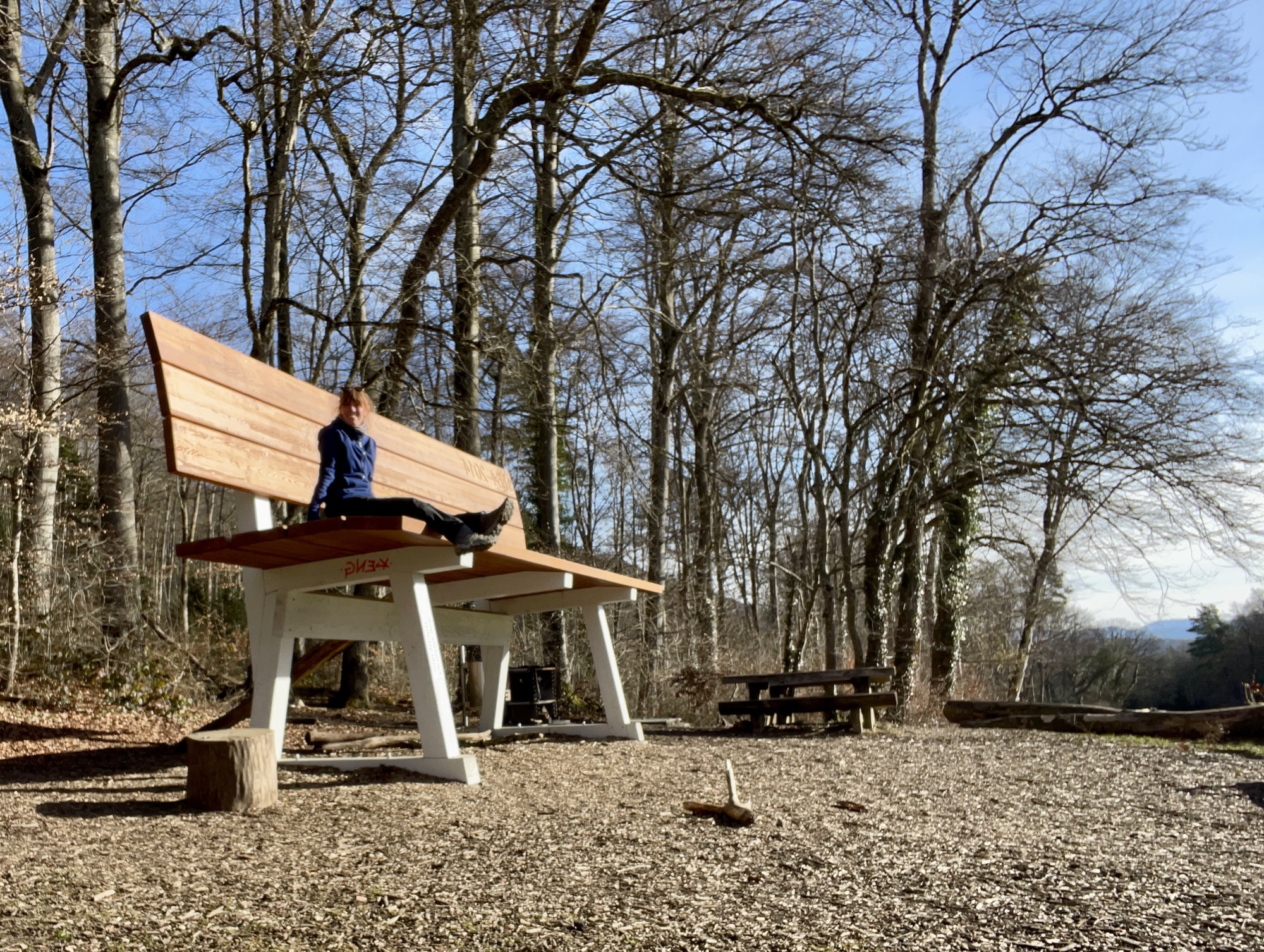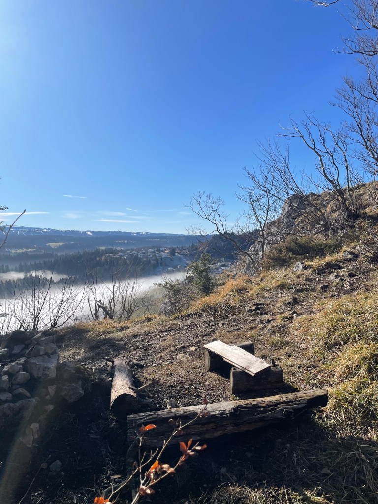 The air was cold when I got out at the busstop; it was clear that the day has not yet been long enough to warm up despite the sunshine. The little trail led almost along the main road but shielded by the big Jura firs on soft meadows I barely noticed it. The birds sang their gentle morning song and I heard woodcutting machines in the distance. Arriving at the Reka Village in Montfaucon, I decided to have my breakfast on a bench with a view over Jura hills and the Chasseral in the far distance.