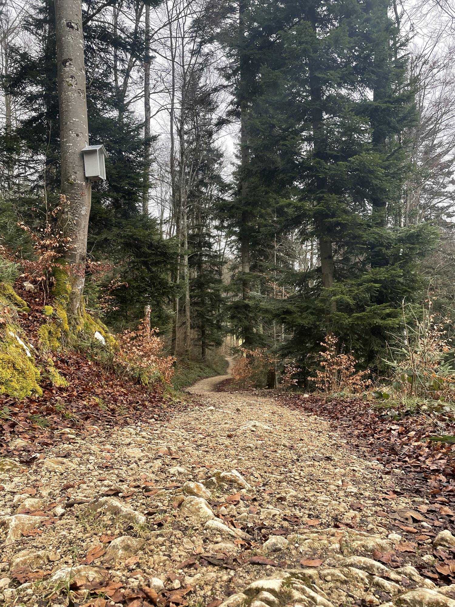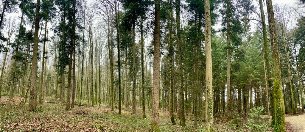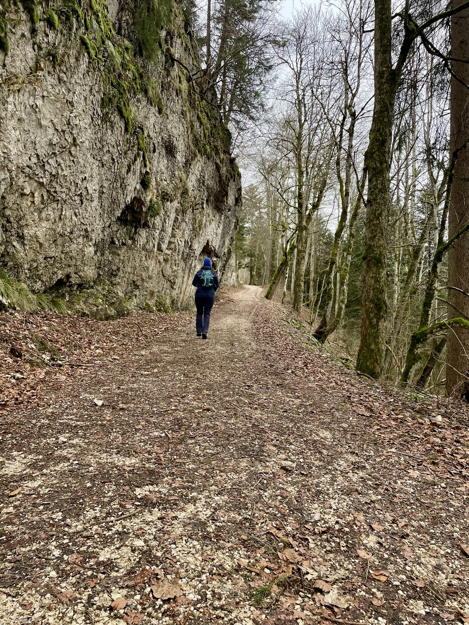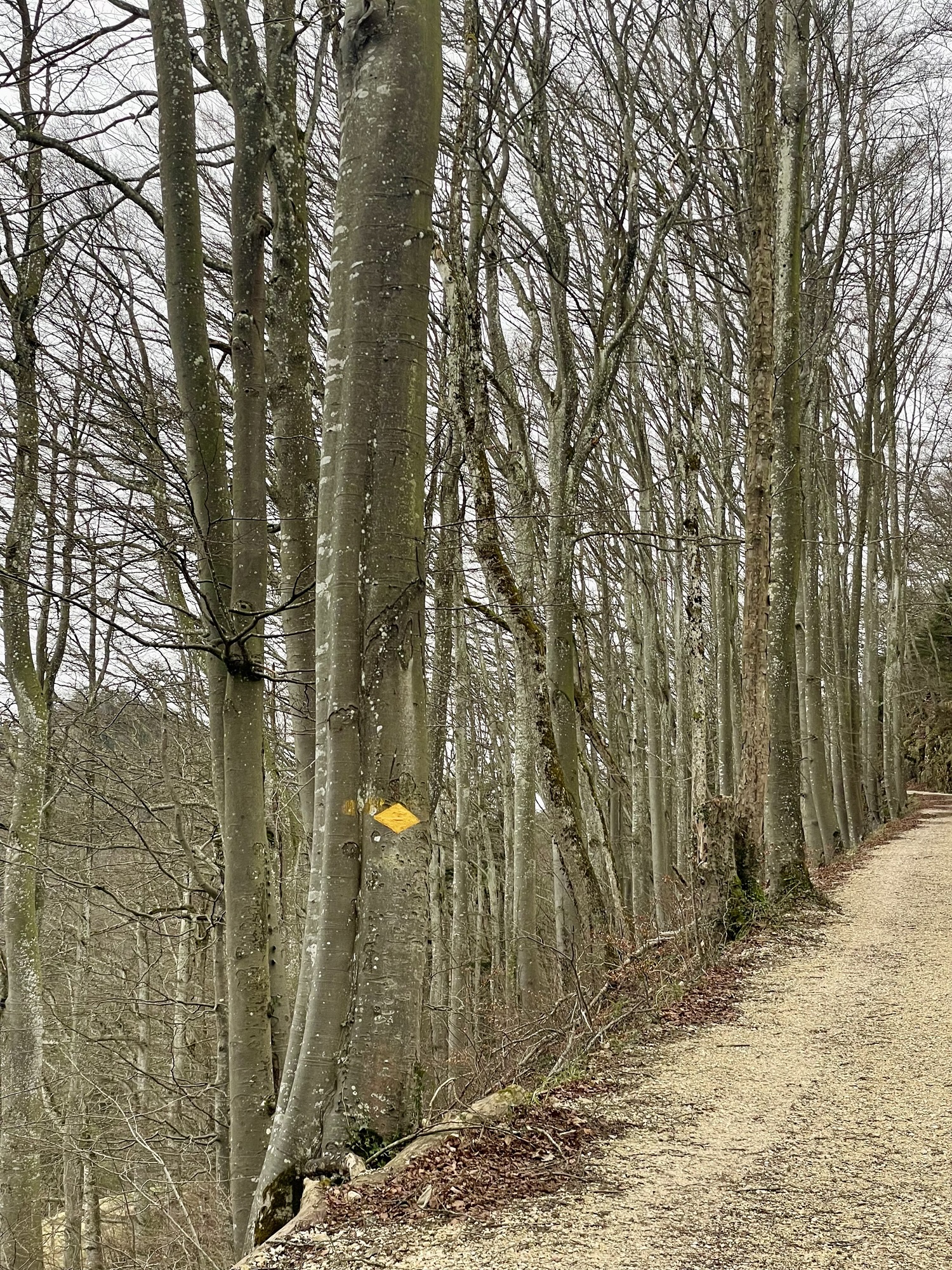 The comfortable 4×4 gravel path lead us over what’s known as the Gempen Plateau. First walking over meadows, we soon entered the forest. Tall slender trees surrounding us, their brown trunks and branches against the grey backdrop looking like stately serious forest creatures.