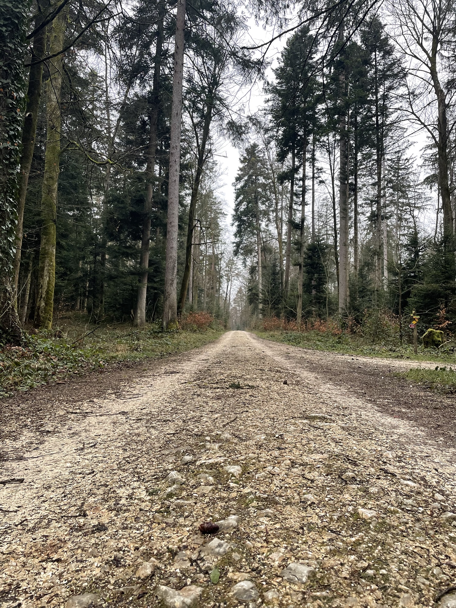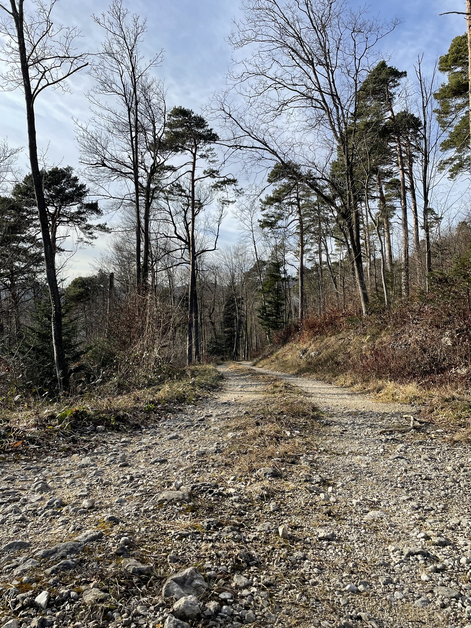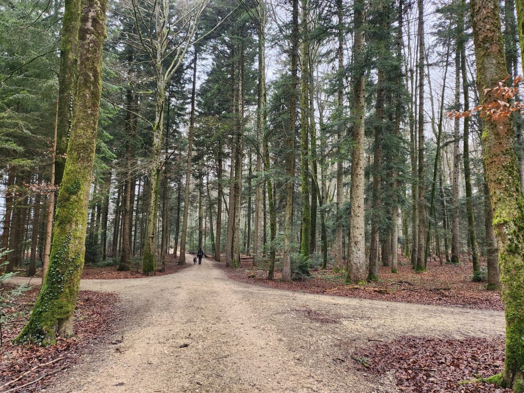 The comfortable 4×4 gravel path lead us over what’s known as the Gempen Plateau. First walking over meadows, we soon entered the forest. Tall slender trees surrounding us, their brown trunks and branches against the grey backdrop looking like stately serious forest creatures.