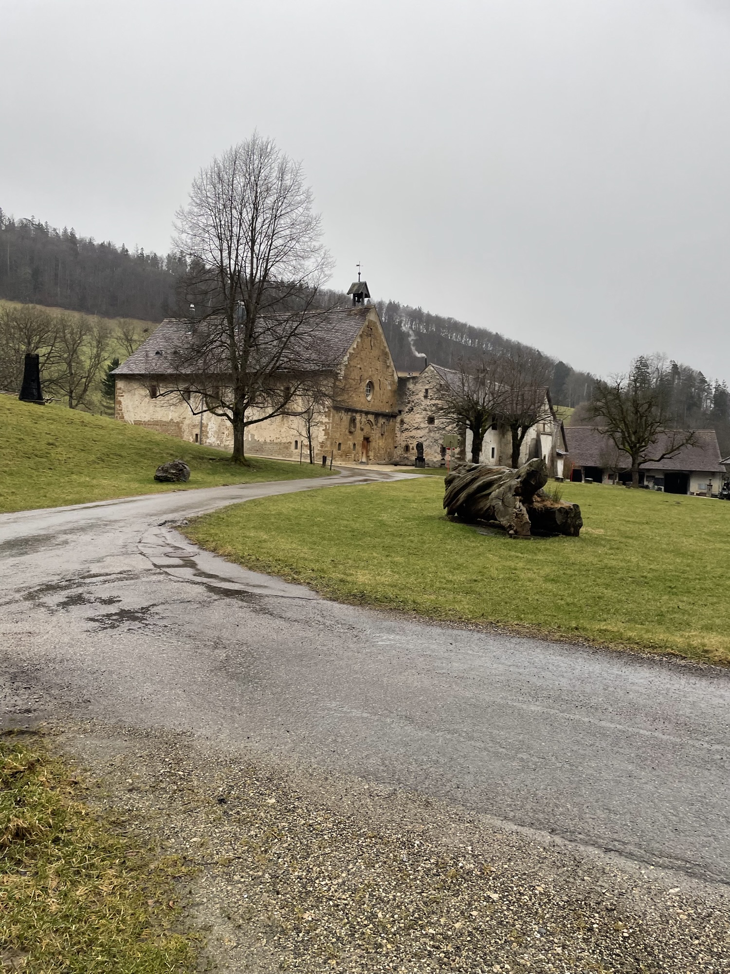 Along the Waldbach we reached the former Kloster Schönthal; with smoke rising from the chimney, a rooster crowing and cows mooing in the stable it painted a very serene picture. Were it not for the slowly increasing rain, it would have made for a very nice picnic spot. But as we started to feel ourselves getting slightly cold from the wet wetaher, we hurried up to reach the village of Langenbruck in the hopes of immediately catching a bus back down to the train.