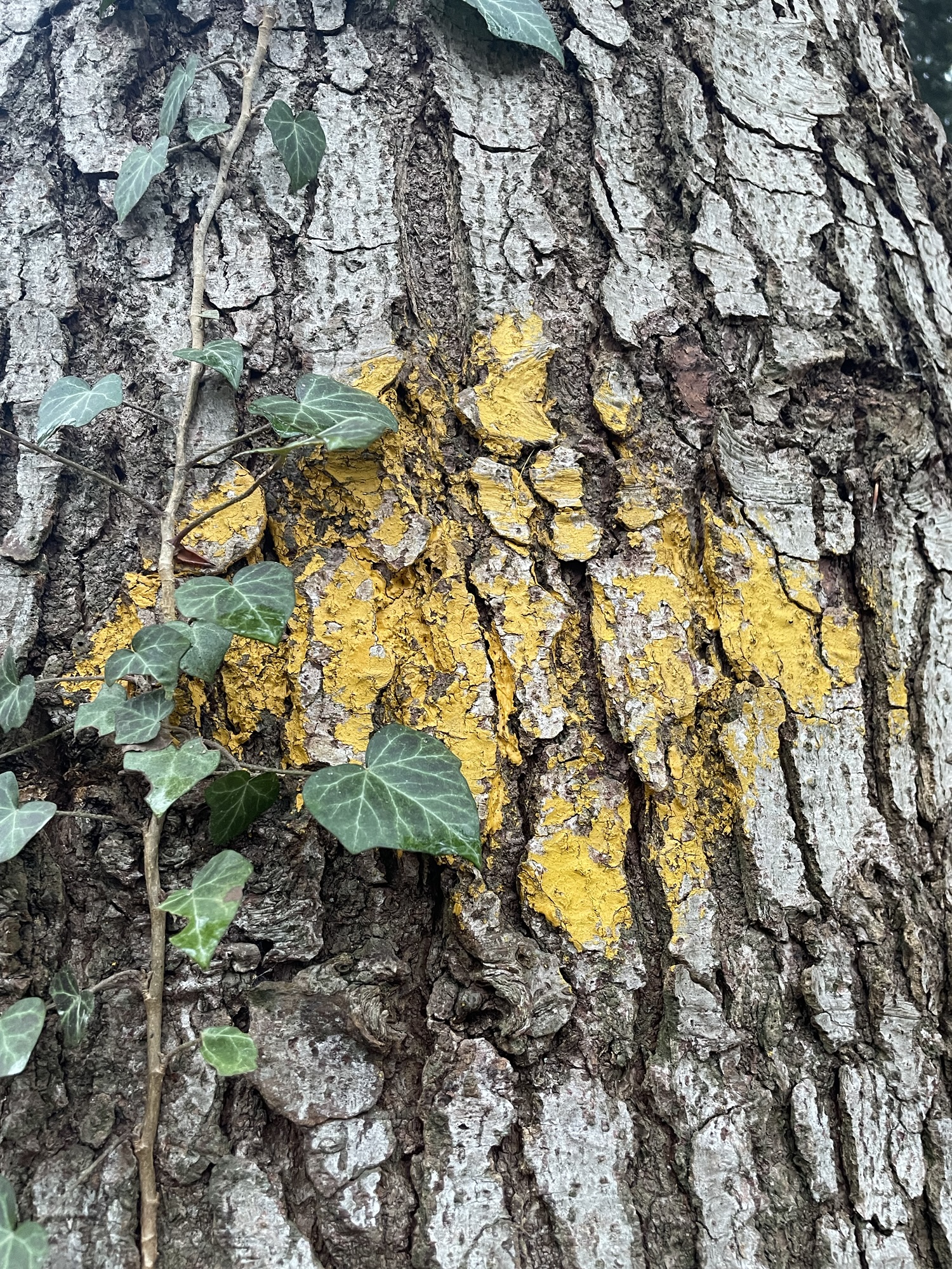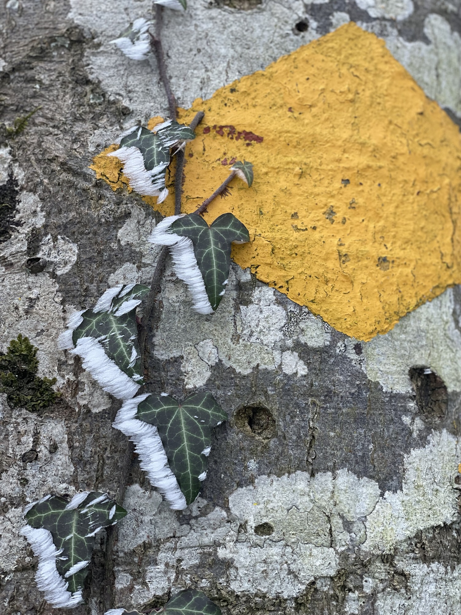 Via a narrow trail I descended into the picturesque Chaltbrunnental, a place I love to visit since I am a kid – especially in the summer months when its rich Flora offers many beautiful shady spots and the possibility to refresh tired feet in the river Ibach. But today I only got small a glimpse of it in passing before continuing on the broad forest path, slowly entering into a very familiar area close to home, walked many a times on calm Sunday afternoons. I enjoyed the solitude, knowing that I would soon enter a more populated area again and started to notice, how much art there is to encounter in the woods. From the bright yellow lichen spreading over the branches of a barren tree, almost looking a bit like tiny fireworks, to the exuberant green of the tree sponges that seamlessly amalgamates with the dripping wet moss covering the tree trunks. The countless shades of brown that create abstract paintings on a piece of bark to tiny scratches from animals on the wood of the tree stems.