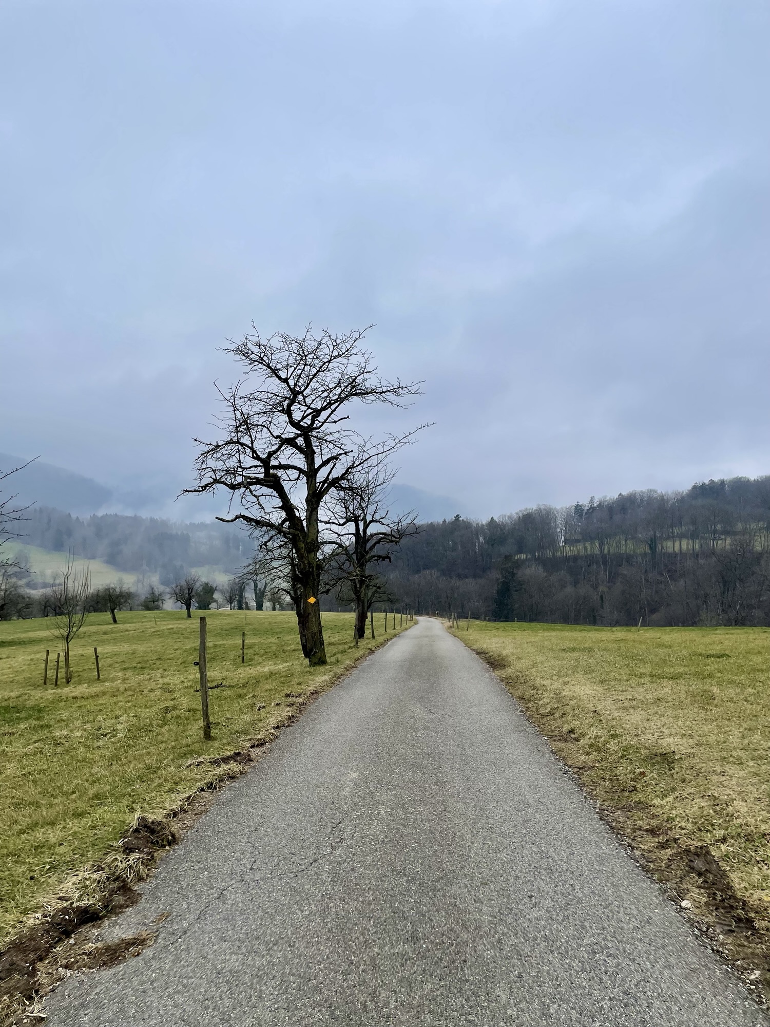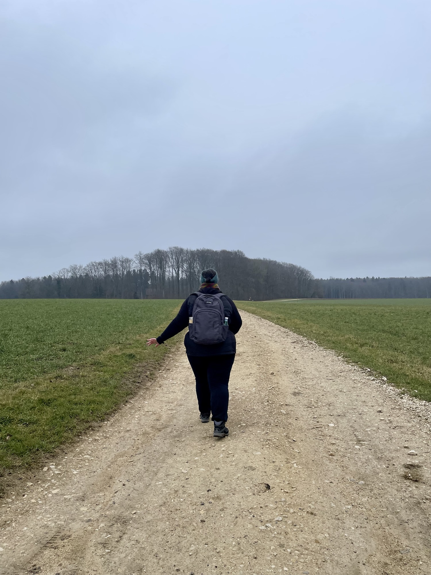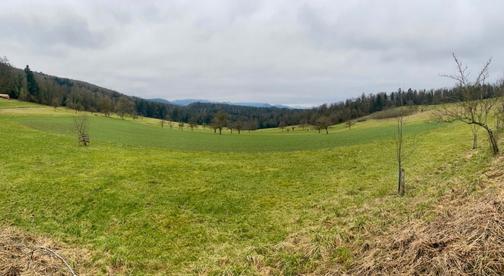 At the edge of the village of Hochwald we decided to sit down and have something to eat and a warm beverage on a bench overlooking what would otherwise be a wide view over the fields. A lady walking her dog stopped and we got to talking about the weather, dogs and her time living in Basel before moving to Hochwald. I am not always happy about interactions with strangers when I am out hiking but sometimes it is exactly those unexpected encounters that make a hiking day complete. We did however agree, to let a group of five elderly hikers pass a bit ahead before continuing our hike as to not having to “share” the trail.