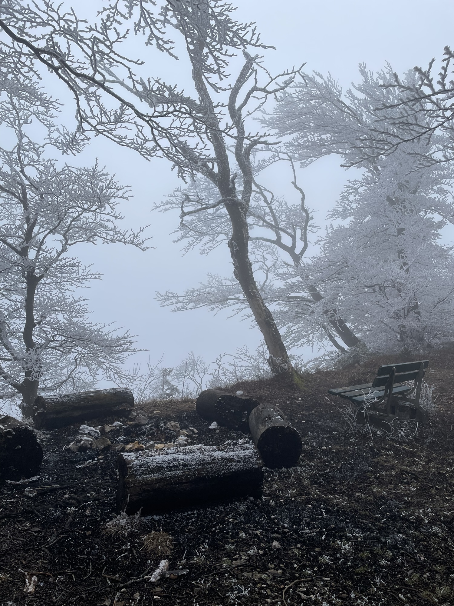 The path followed along the ridge over pastures covered with a thin layer of frost, crackling beneath our feet. After passing by the sadly closed restaurant Tiefmatt and passing the Rinderweidgraben, we started the climb up to the Roggenschnarz. Stairs lead up through the forest over rocks, a short but sweat inducing climb before we ended up under a roof of ice covered tree branches. Almost reminiscent of strokes of white paintbrushes, it felt as if we entered a painting of a serene winter landscape. It was one of those sceneries I had a tough time believing is real.