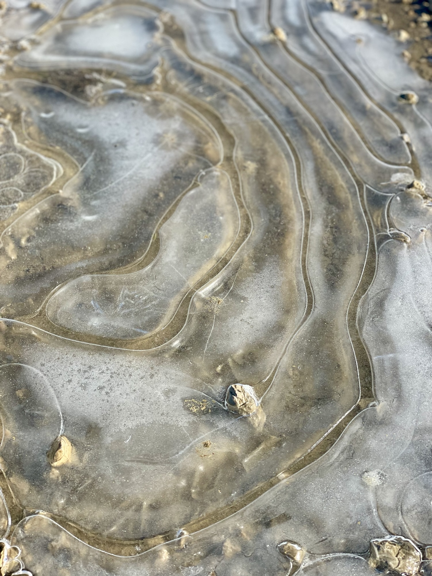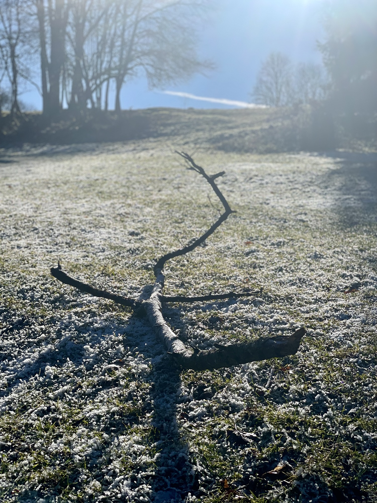 After leaving the village of Montfaucon behind me, I headed down to Les Enfers, a little village whose name always stood out to me – the underworld. It comes from the latin word “infernu”, which means deeper located and refers to the rocky valley flank of the Doubs. Over the pastures of Fond des Rondez I headed to the next little hamlet Les Sarains. The puddles on the gravel path were frozen over and, with the sunlight shining on them, revealed unique patterns. Curved lines, asymmetrical shapes and tiny cracks in the ice made it look like a piece of modern art.