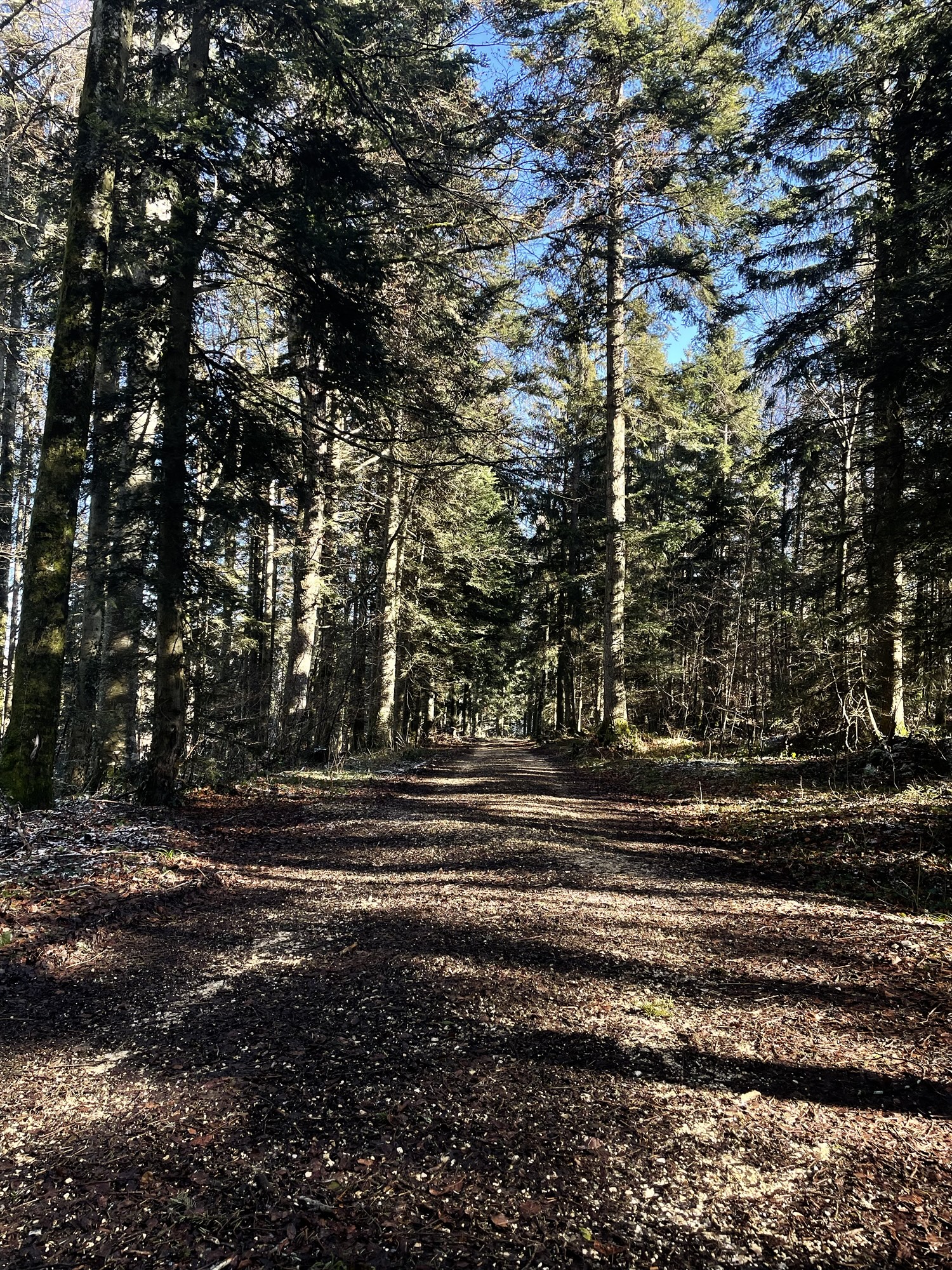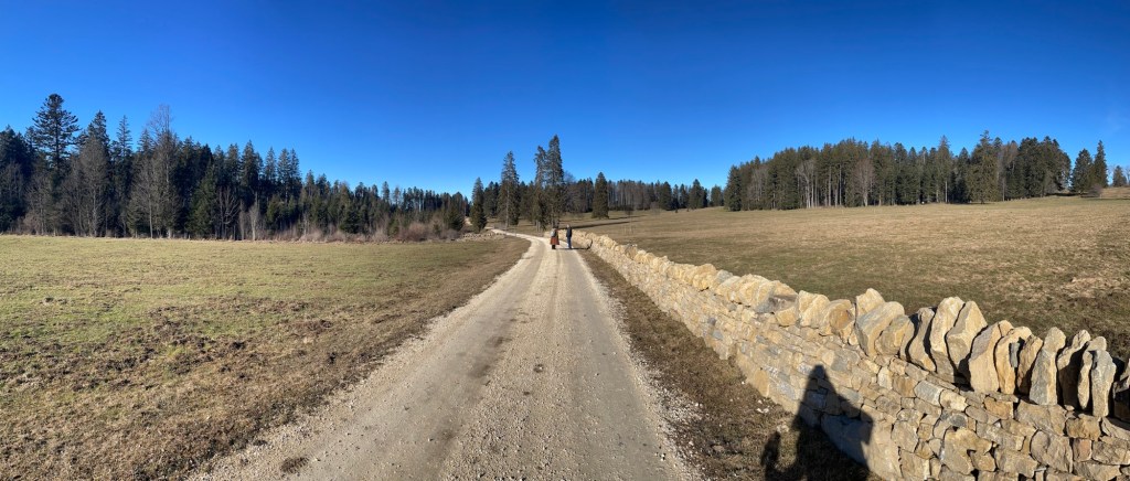 Our trail led out of Bellelay and up though the Forêt de Béroye, a slightly unexpected tiring ascent in the equally unexpectedly warm midday sun. The climb was worth it though, as we found ourselves on a beautiful vast plane meadow surrounded by tall fir trees, a perfectly straight path ahead of us and a gentle wind blowing ever so slightly over my warmed up face. It somehow felt as if we were walking under a giant blue dome, the hue of the sky was almost surreal and we encountered no other people and marveled at the absolute stillness; the only sound came from our footsteps on the backroad. Our shadows stretched out almost comically long on the floor and the golden afternoon light enveloped everything in a warm glow. This fast became my favorite part of todays section; I relished the effortless path with no uphill and very little downhill and hearing my parents reminisce about the good old days next to me. I always chuckle about how they tell each other the same stories from time to time but keep finding new details and marvel with such genuineness at each others life achievements.