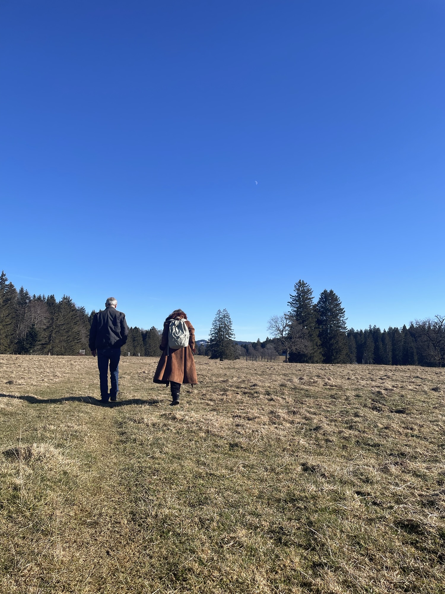 We made our way out of the village and crossed the large meadow of Pré Piat. It was another sunny day up here. The sky was a beautiful cerulean blue and in the distance I could see the sickle of the crescent moon. Trees many times my age stood in line left and right, as if they were the welcome comity. We took a moment to admire them, before descending through the Forêt de Montbautier via a steep and icy little incline, that finally convinced my dad to try one of my hiking poles for more stability and, when safely arriving on even ground, let him admit that it maybe was time for new hiking boots. “They are ancient”, he said, lifting up one of his feet to show the shoe sole, whose profile had completely disappeared. And I once again remembered that my parents had been on this earth a whole lot longer than me. Not that I wasn’t aware of our age difference – they are my parents after all – but sometimes, now that I am also a self sufficient adult (or so I say), I sometimes briefly forget about it. While I will always consider them first and foremost my mother and my father, they are also life companions, and over the years became friends in a way. As a kid we rely greatly on our parents, or other parental figures to explain the world to us; answering our 1’000 questions a day and indulging our every thought. As we get older that naturally starts to change and we indulge each others thoughts and philosophize about the world. And that’s how I suddenly am walking along a very icy path with the two of them, hoping they don’t slip away from me, explaining to them what a “Tradwife” is.