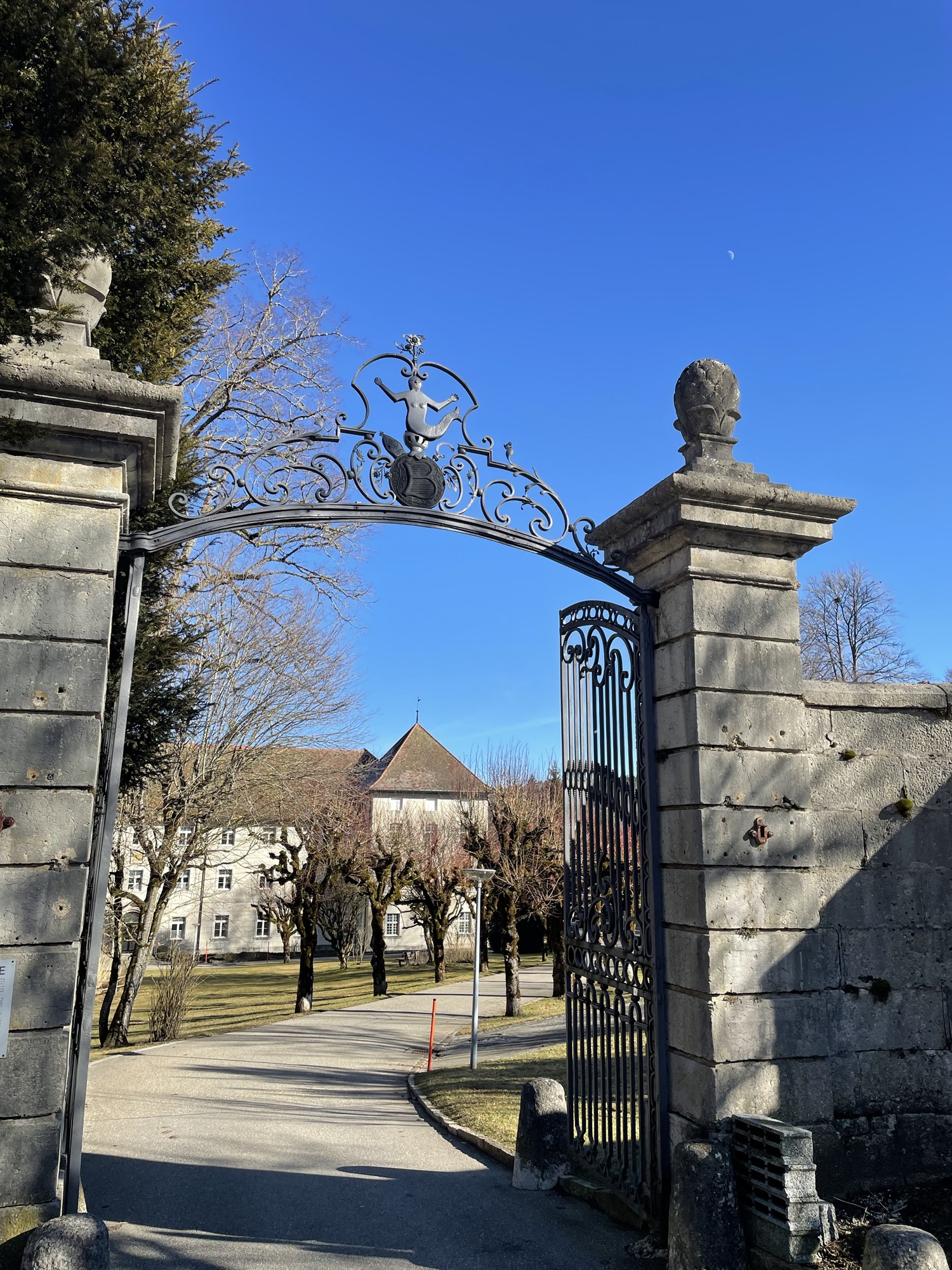 After having crossed the moor of La Sagne we could already see the monastery village of Bellelay. When choosing the hike for my parents, I knew I wanted to find a tour that connects to history. Both my parents love places filled with a rich and intriguing history; be it buildings, castles, monasteries, medieval villages, archaeological sites, places of power or old trees tied to an ancient legend. Bellelay was our first stop today, where such history was visible with the impressive building of the former abbey. According to a legend, the monastery was founded in 1136 by a Provost of the Moutier-Grandval Abbey who, while hunting a boar got injured and lost in the woods of the Franches Montagnes. He vowed to found a monastery there if he should ever find his way back home. After he returned home after four days in the wilderness, he made good on his promise and founded the monastery and gave it the name “Bellelay” which derives from “belle laie” and translates to “beautiful pig”. This is in all likelihood is not the most realistic scenario on how the abbey came to be but I liked it the best. Today the former abbey has found a new purpose and is a cultural center which hosts various concerts and art exhibitions throughout the year.