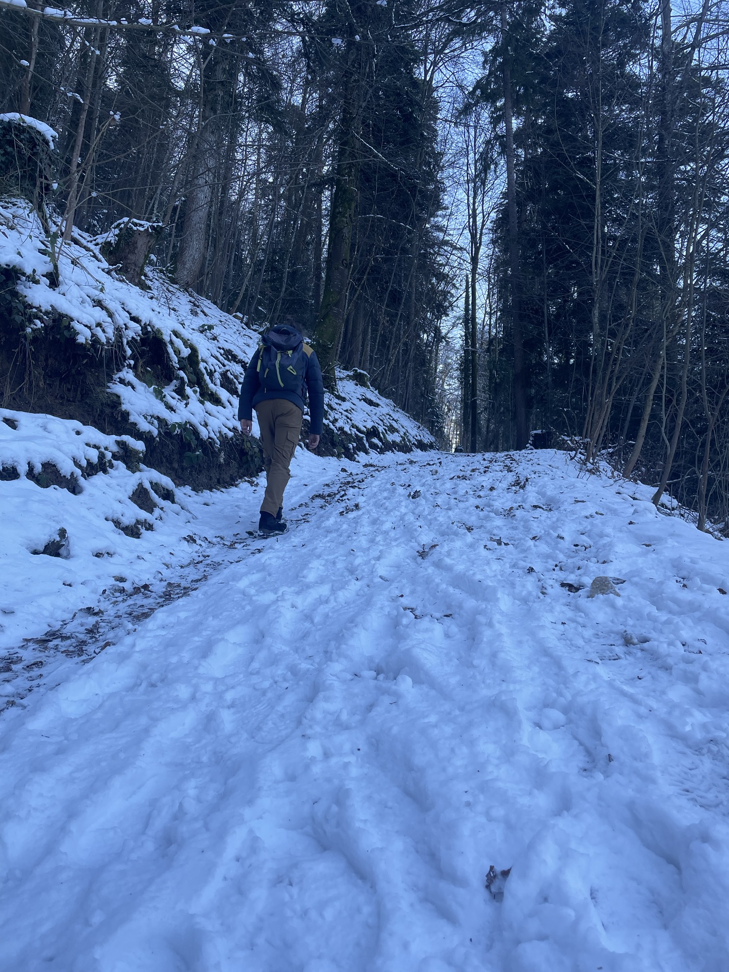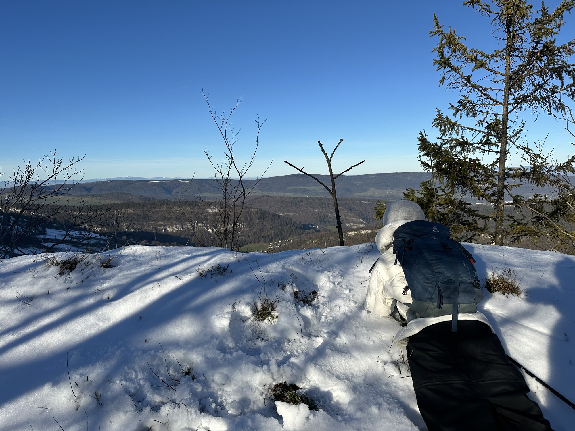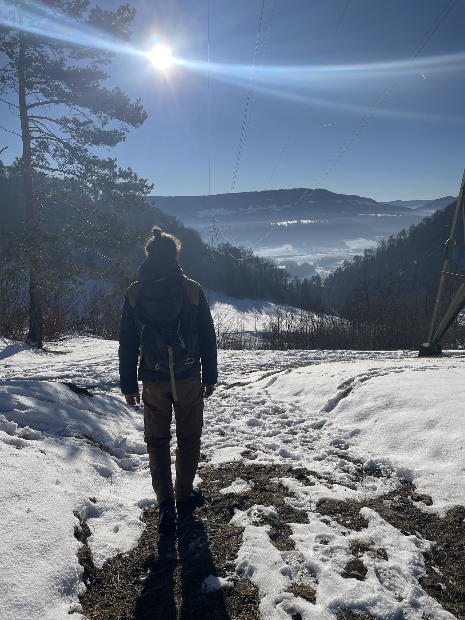 We continued on through the forest and while I did want to avoid having to walk on a ridge in the dark, there was also a certain thrill about the possibility to not make it down to Delémont within the last daylight. We didn’t bring our head torches, which is something I have since made a permanent resident in my backpack; because the chance always exists that a hike takes longer than planned. But for now we still got to enjoy the magnificent views without any artificial light. The difference between the green fields down in the valley and the white snowy landscape up here almost seemed like a glitch in natures system.