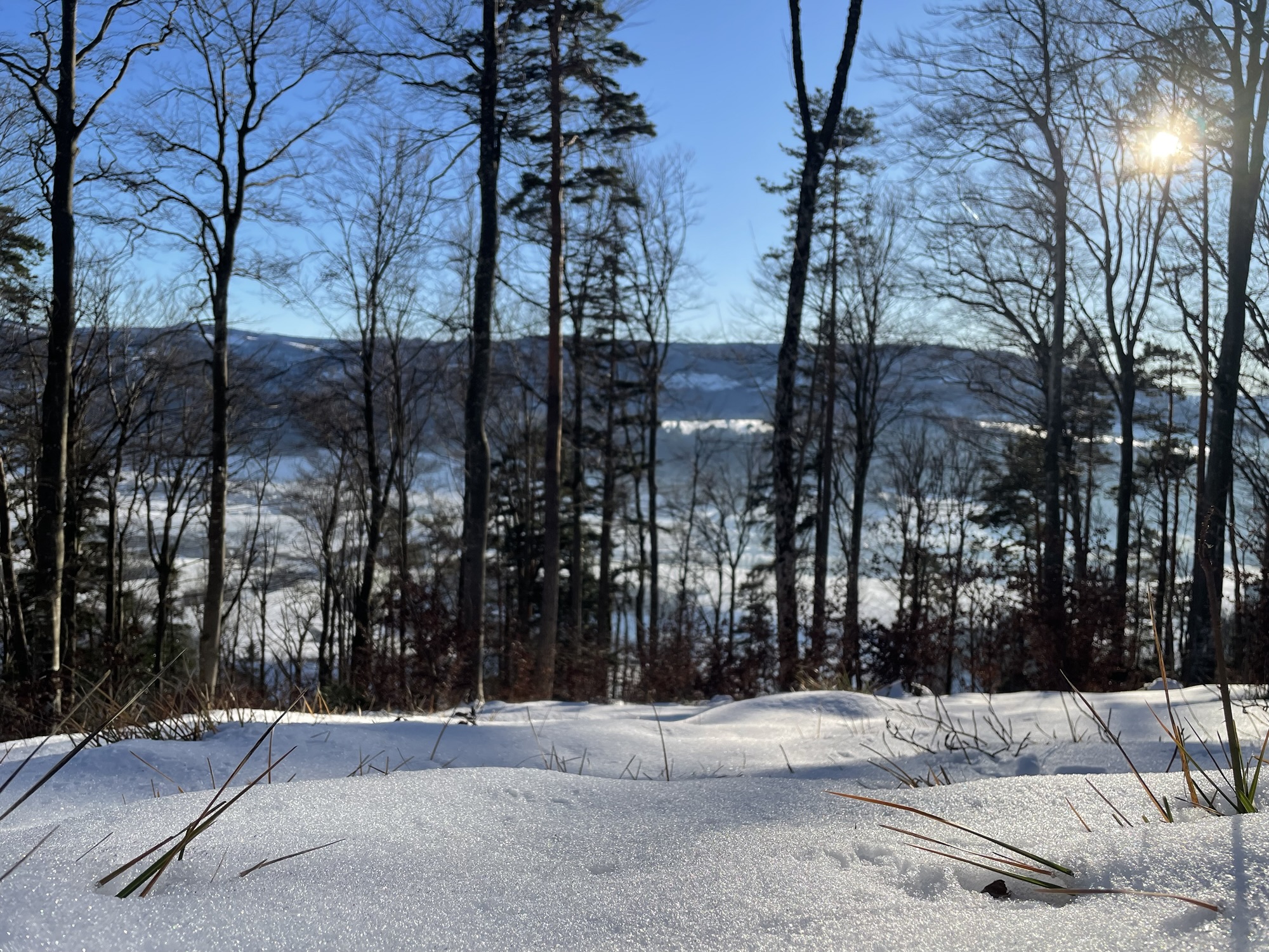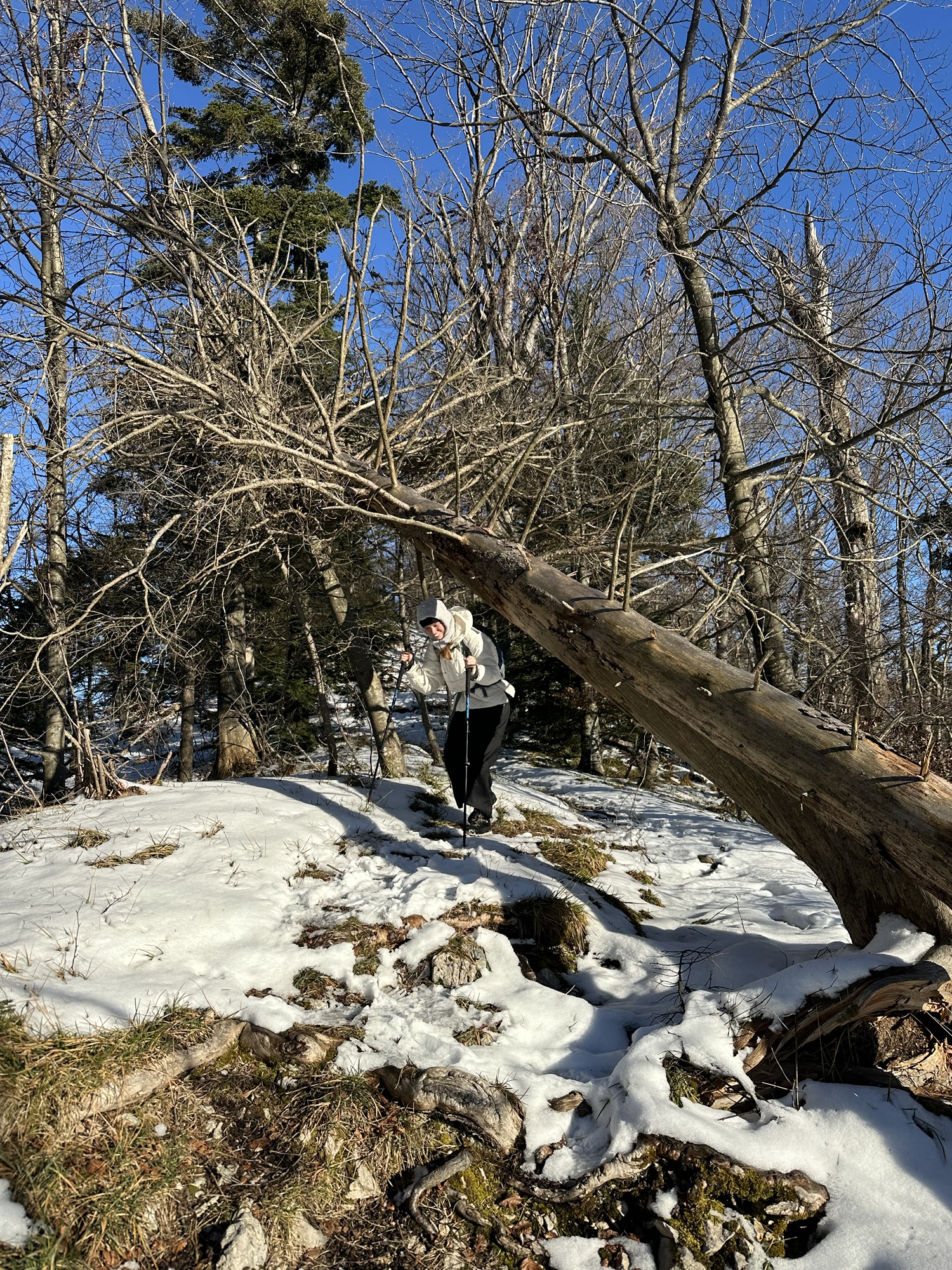 While the drop was steep, especially on the southern slope, I was relieved to find the trail to be rather comfortable. More than that – the scenery was welcoming and reassuring me that we were there at exactly the right time. There was a silence that felt so soothing, and it was as if we had entered a sanctuary created by benevolent winter fairies. The dimmed winter sun shone through the barren trees. The absence of leaves on the branches allowed us a to walk in continuous golden light as well as offering us stunning views left and right all the while feeling hidden and shielded from the world “down there”.