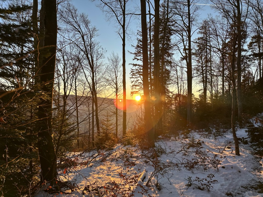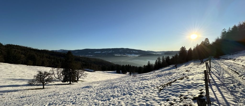 The trail shifted from a narrow track over the ridge to a more broad path, leading us under roofs of snowy branches, before arriving at the pasture at Retemberg where we got to admire the Val Terbi a second time along with the hills and mountains further in the back; the Mont Raimeux, as well as the first Jura chain behind. A soft thin layer of myst, almost like a veil lay above the valley, the sky in the back already slowly changing its color, promising a colorful sunset.