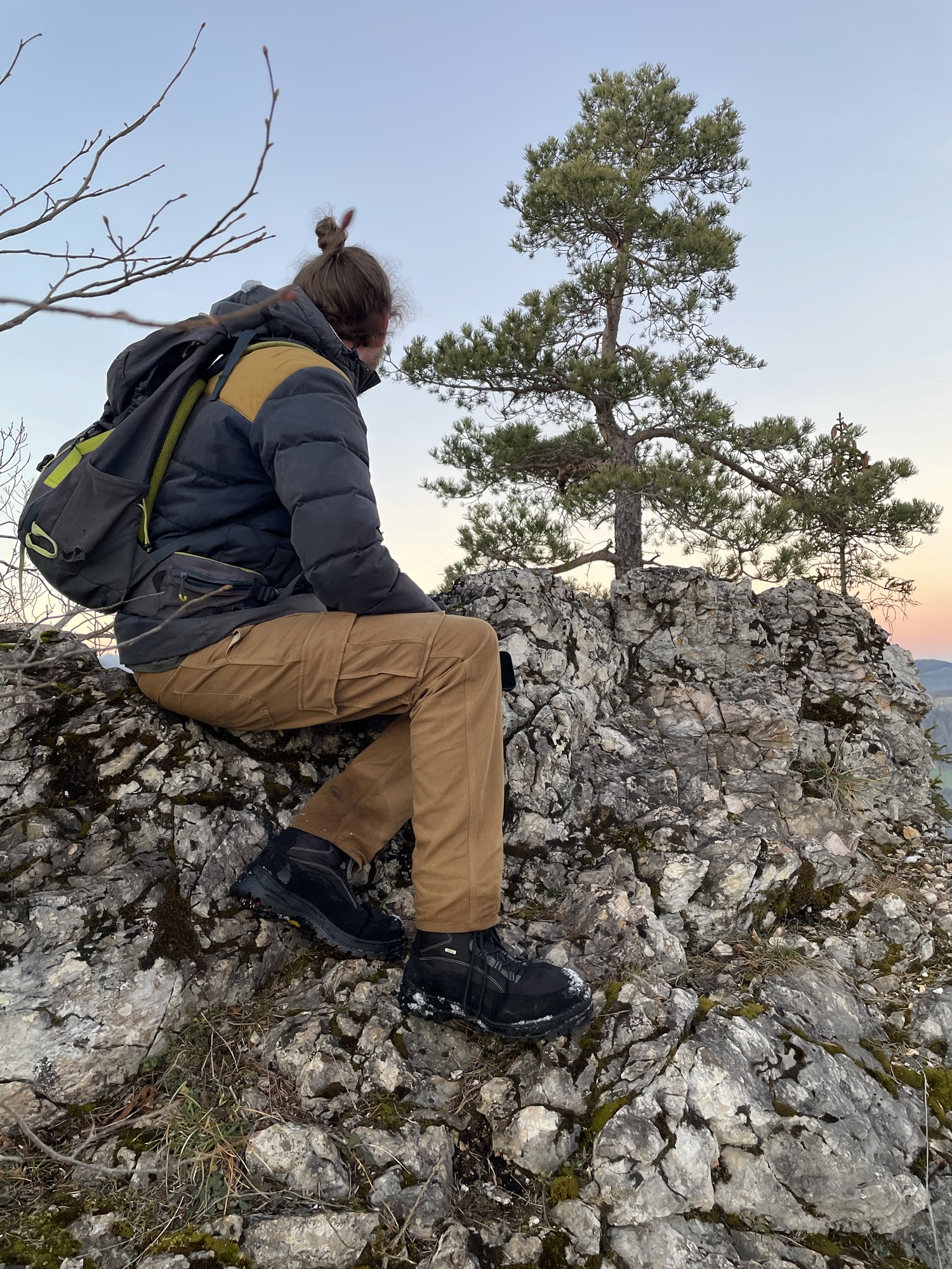 We climbed up to the edge of the ridge to even closer enjoy the view, with Sam heroically standing as close as possible to the edge, giving me a nervous tingle shooting through my body. While he effortlessly walked back down on the trail, I decided on the less elegant but safer option of sliding back down on my behind.