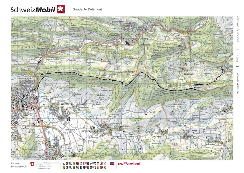 | Grindel to Delémont | Difficulty: T1 (Hiking Trail) Length: 15.4 km Duration: 4:50 h Ascent/Descent: 696m/859m |